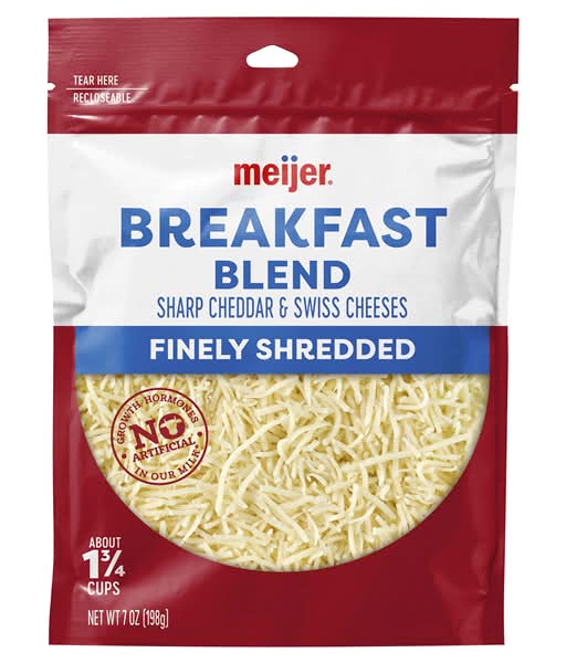 Meijer Shredded Breakfast Sharp Cheddar & Swiss Cheese is a blend of Sharp Cheddar and Swiss cheeses, conveniently available in a shredded form. It is designed to enhance breakfast dishes such as omelets, scrambled eggs, and quiches, offering a suitable cheese option for early meals.