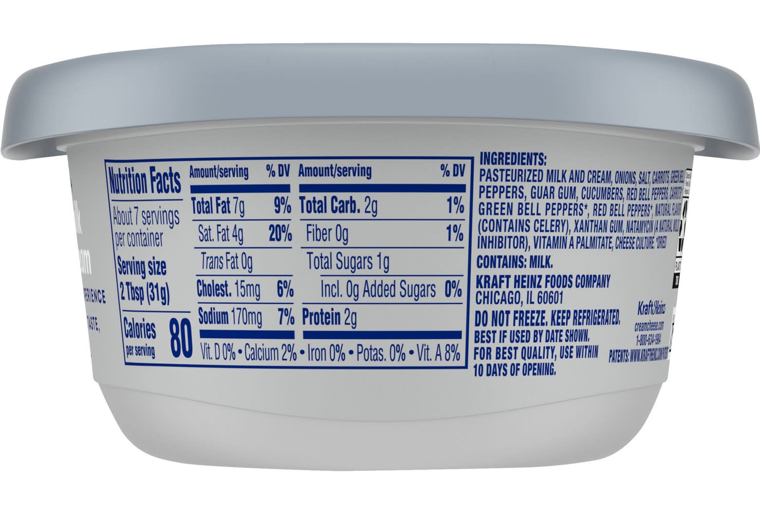Ingredients: PASTEURIZED MILK AND CREAM, ONIONS, SALT, CARROTS, GREEN BELL PEPPERS, GUAR GUM, CUCUMBERS, RED BELL PEPPERS, CARROTS*, GREEN BELL PEPPERS*, RED BELL PEPPERS*, NATURAL FLAVOR (CONTAINS CELERY), XANTHAN GUM, NATAMYCIN (A NATURAL MOLD INHIBITOR), VITAMIN A PALMITATE, CHEESE CULTURE. *DRIED Contains: Milk, Celery