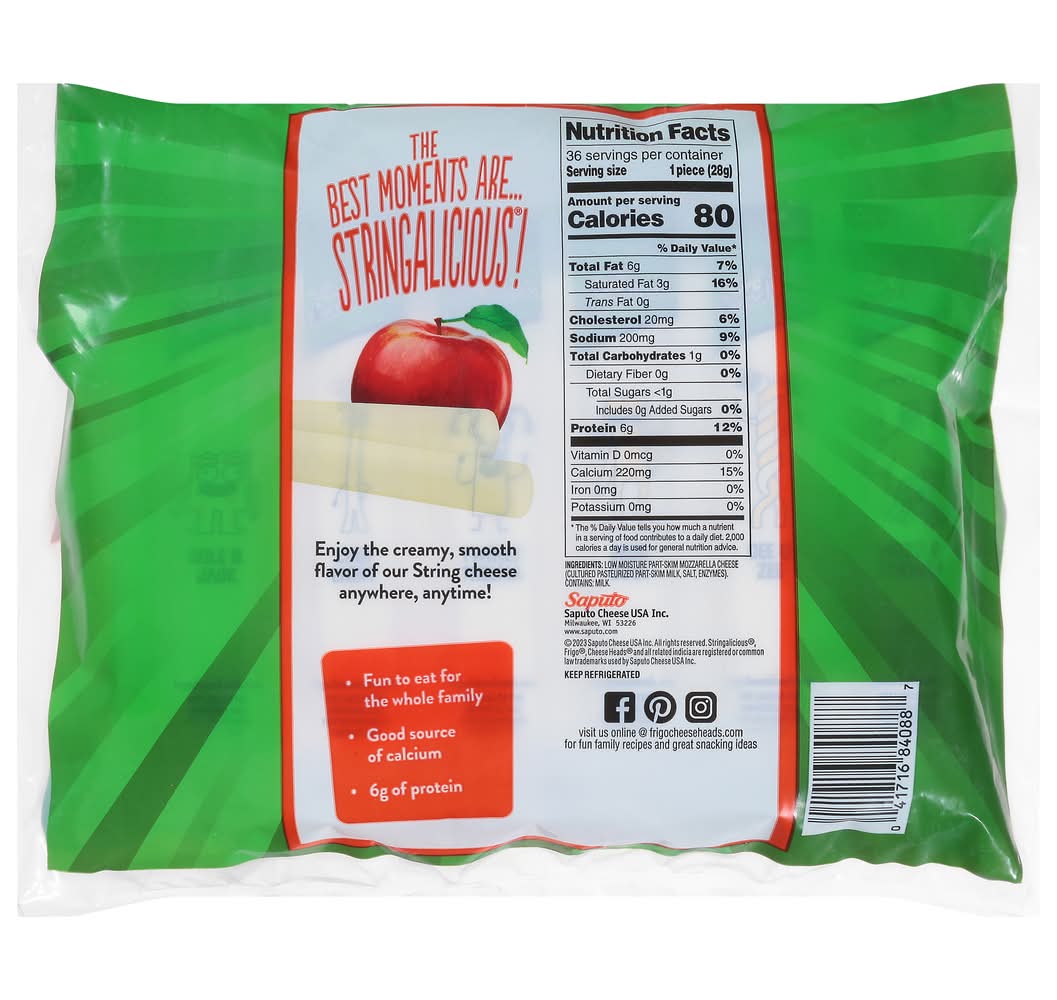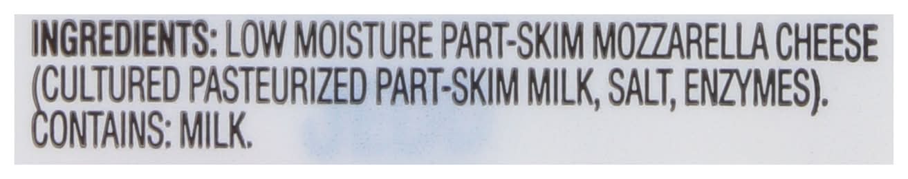 Ingredients: Low Moisture Part Skim Mozzarella Cheese (Pasteurized Part Skim Milk, Cheese Cultures, Salt, Enzymes) Contains: Milk