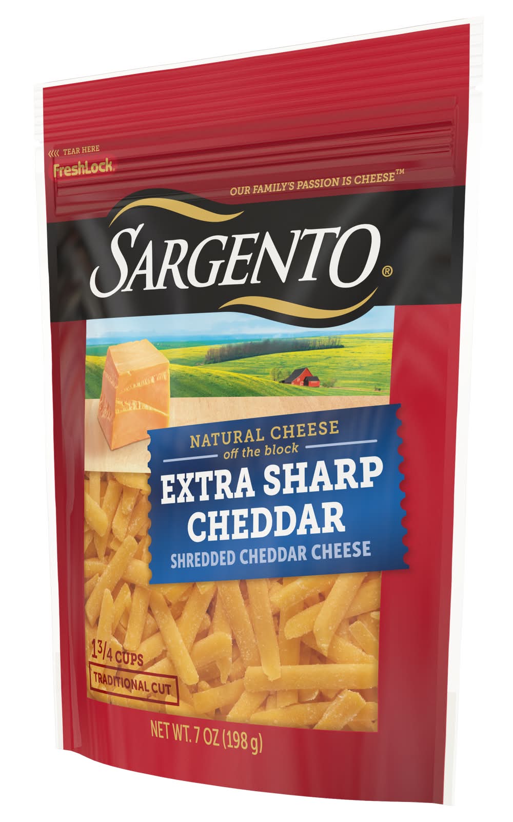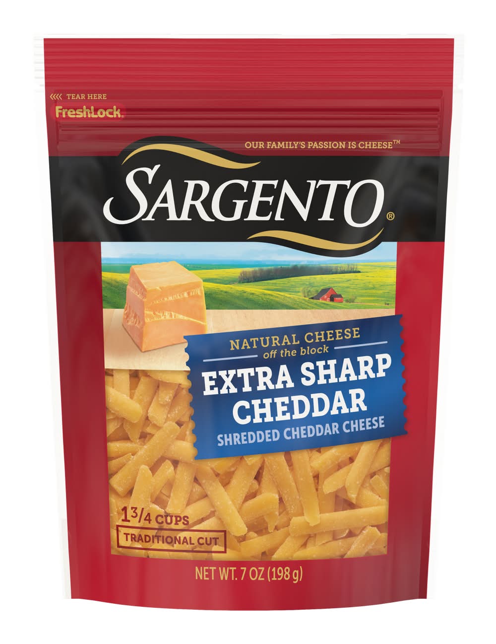 Bright and bold. Nutty and savory. Shredded fresh from blocks of real, natural cheese, Sargento® Shredded Extra Sharp Natural Cheddar Cheese, Traditional Cut brings layers of flavors to every meal and brings all your flavors together. Bring a bold bite to breakfast burritos with scrambled eggs, chorizo, sauteed breakfast potatoes and crispy sweet bell peppers. Extra sharp cheddar elevates a simple grilled cheese sandwich, and the sharp, nutty flavors play beautifully with tomato soup. And stuffed inside roasted chicken breast with spinach, herbs, and sundried tomatoes • Flavor: Extra sharp cheddar • Sargento Foods Inc., One Persnickety Place, Plymouth, WI, 53073