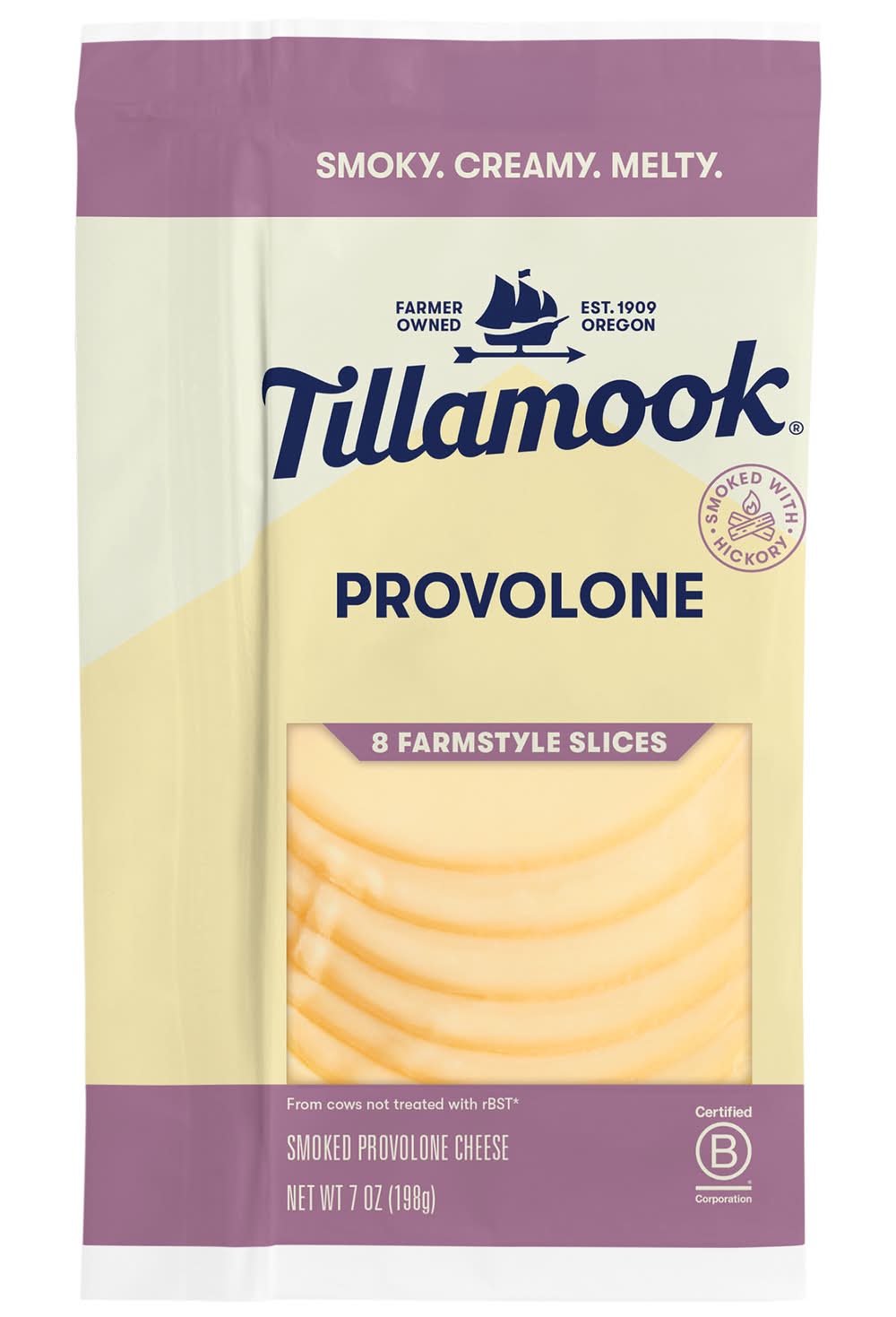 Tillamook Farmstyle Provolone Cheese Slices are cut thicker, creating bigger, bolder flavor in every bite. Featuring a smooth and creamy texture with a hint of hickory smoke, this sliced provolone cheese adds bold flavor to your burgers, sandwiches and cheese snacks. Full of flavor, these sandwich cheese slices are a crowd-pleaser and add extra melt to every warm dish. Tillamook Cheese tastes better because it's made right. These provolone slices use high-quality pasteurized milk from cows not treated with rBST* and never include artificial flavors or preservatives. Better yet, you can be assured that each purchase you make helps support Tillamook in their pursuit to do right. As a Certified B Corp, Tillamook is committed to being good stewards of cows and farms, of people and products, their communities and the environment. With over 110 years of quality cheese-making experience backing them, Tillamook Cheese Slices have a taste to remember. Do Right By Every Bite.*The FDA has stated that no significant difference has been shown between milk derived from rBST treated and non-rBST treated cows. • Flavor: Provolone • Tillamook County Creamery Association, Tillamook, OR, 97141