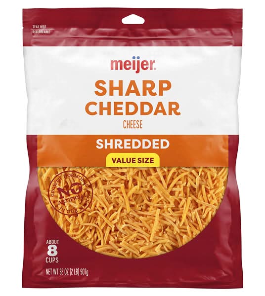 Whether you use it in a classic grilled cheese or get creative with buffalo chicken mac and cheese, Meijer Finely Shredded Sharp Cheddar Cheese is perfect for any meal. Tangy and bold, this cheese so good, you could eat it right out of the bag.