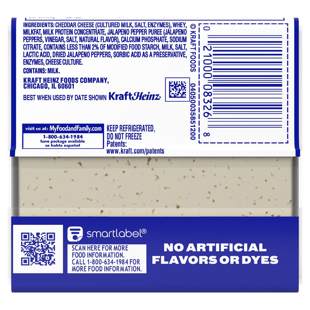 Ingredients: CHEDDAR CHEESE (CULTURED MILK, SALT, ENZYMES), WHEY, MILKFAT, MILK PROTEIN CONCENTRATE, JALAPENO PEPPER PUREE (JALAPENO PEPPERS, VINEGAR, SALT, NATURAL FLAVOR), CALCIUM PHOSPHATE, SODIUM CITRATE, CONTAINS LESS THAN 2% OF MODIFIED FOOD STARCH, MILK, SALT, LACTIC ACID, DRIED JALAPENO PEPPERS, SORBIC ACID AS A PRESERVATIVE, ENZYMES, CHEESE CULTURE. Contains: CONTAINS: MILK.