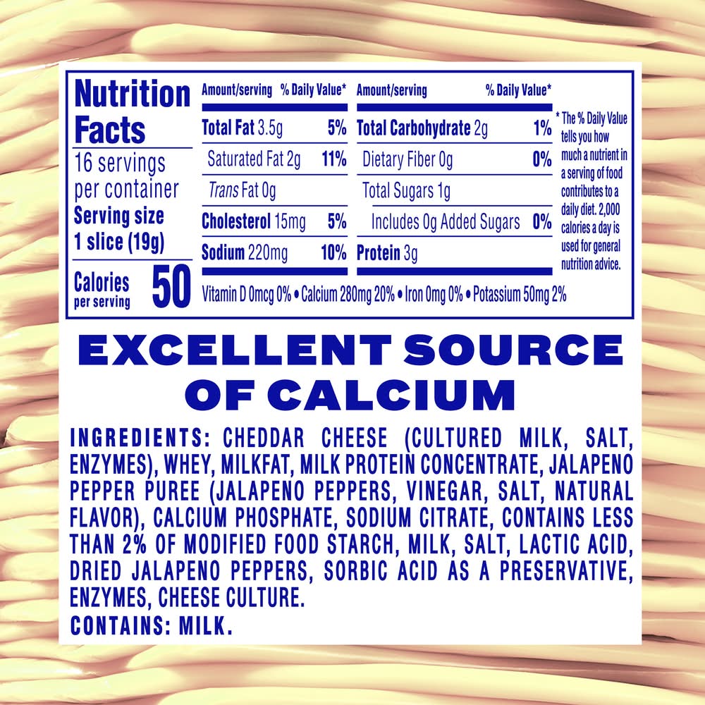 Pasteurized prepared cheese product with jalapeno peppers. No artificial flavors or dyes. 50 calories per slice. See nutrition information for saturated fat and sodium content. Excellent source of calcium.