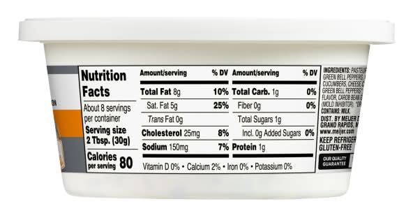 Meijer Garden Vegetable Cream Cheese Spread is crafted to enhance the flavor of bagels, toast, or dipping snacks. It includes a blend of onions, carrots, red and green bell peppers, cucumbers, and celery, contributing to its creamy, slightly off-white green appearance. The texture is soft and spreadable, suitable for a variety of uses. Its flavor profile is sweet and slightly spicy, with prominent tastes of onion and chive. The ingredients list features farm fresh cultured milk, cream, salt, stabilizers, garden vegetables, and spices. It is categorized as a fresh, non-cured type of cheese.
