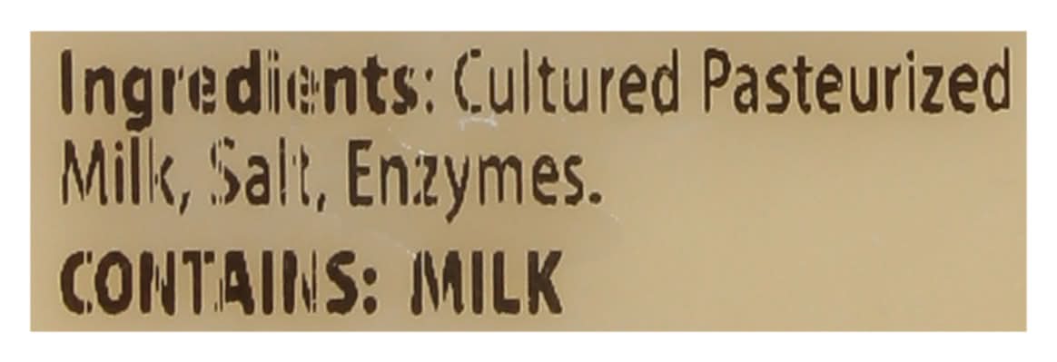 Ingredients: Cultured Pasteurized Milk, Salt, Enzymes Contains: Milk