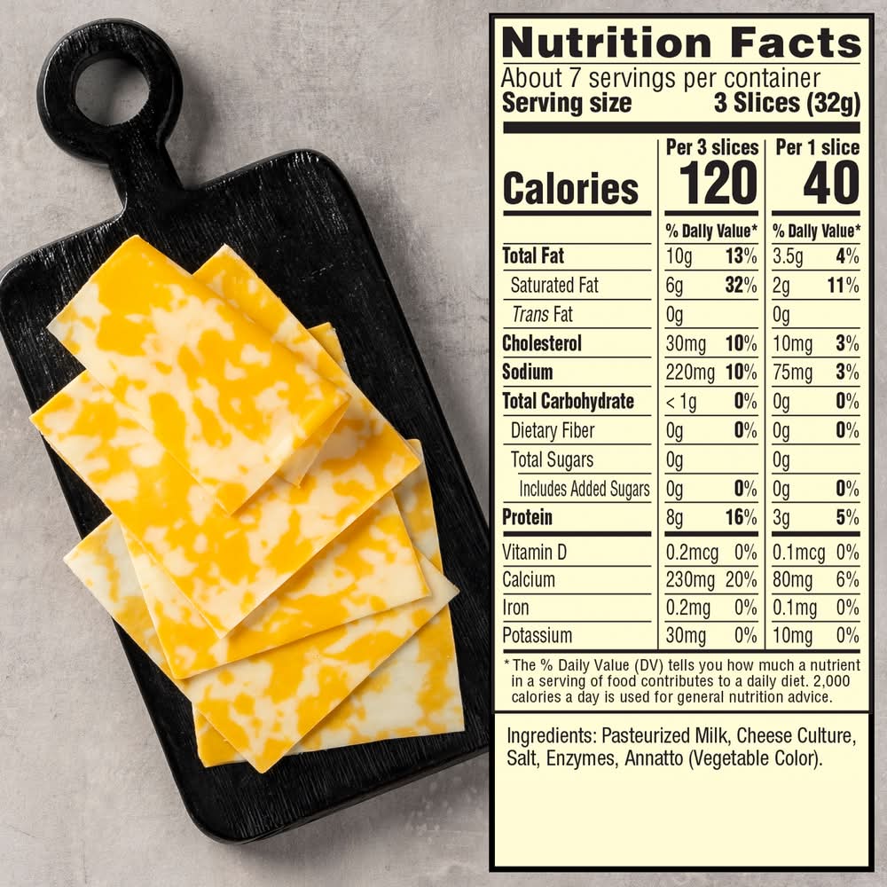 Ingredients: Pasteurized Milk, Cheese Culture, Salt, Enzymes, Annatto (Vegetable Color), . Contains: Milk