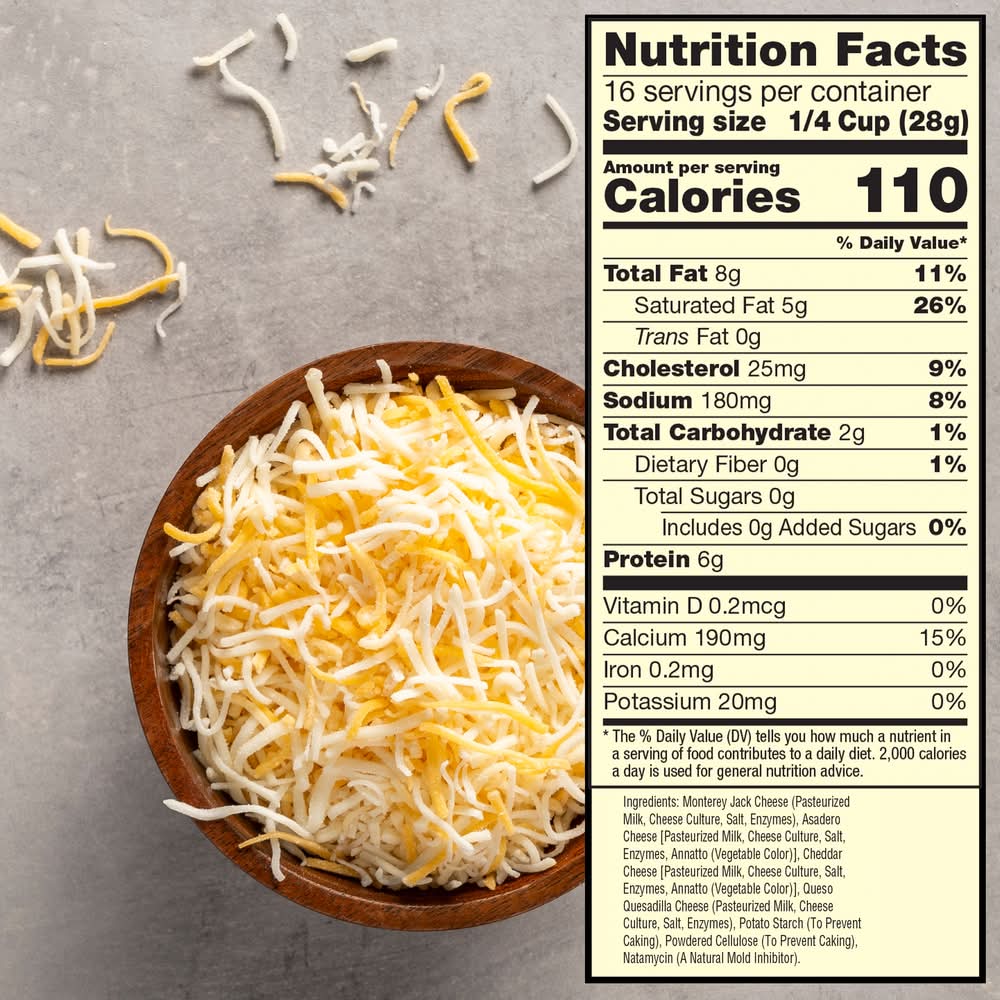 Ingredients: Monterey Jack Cheese (Pasteurized Milk, Cheese Culture, Salt, Enzymes), Asadero Cheese [Pasteurized Milk, Cheese Culture, Salt, Enzymes, Annatto (Vegetable Color)], Cheddar Cheese [Pasteurized Milk, Cheese Culture, Salt, Enzymes, Annatto (Vegetable Color)], Queso Quesadilla Cheese (Pasteurized Milk, Cheese Culture, Salt, Enzymes), Potato Starch (To Prevent Caking), Powdered Cellulose (To Prevent Caking), Natamycin (A Natural Mold Inhibitor) Contains: 'Milk Contains'