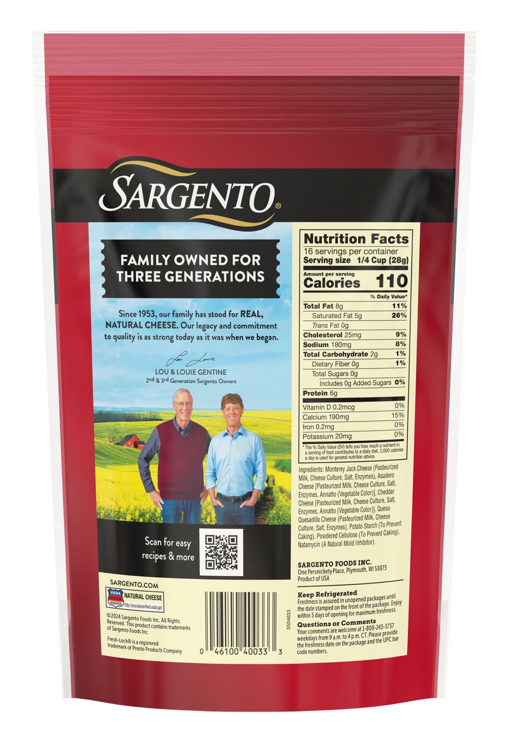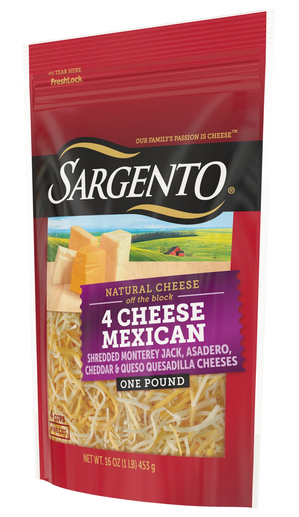 Fresh and creamy. Rich and buttery. Sargento® Shredded 4 Cheese Mexican Natural Cheese, Fine Cut is gorgeous on breakfast tacos with scrambled eggs, refried beans, diced sweet peppers and cilantro. It plays beautifully in a Tex-Mex inspired salad with chicken, black beans, sweet, corn, diced tomatoes and slices of avocado. Sargento® Shredded 4 Cheese Mexican Natural Cheese, Fine Cut brings authentic flavors to tortas piled high with carne asada, guacamole, cabbage, tomato, pickled onion and thin slices of jalapeño. And this 1 lb package is perfect for big gatherings and busy families. Always shredded fresh from the block, Sargento® Shredded 4 Cheese Mexican Natural Cheese, Fine Cut brings convenience to your kitchen and a whole lot of smiles to your table. This is 100% real, natural cheese from Sargento, a third-generation, family-owned company Number of servings: 16