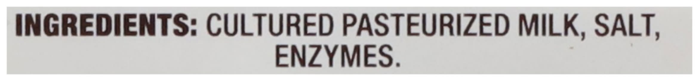 Ingredients: Cultured Pasteurized Milk, Salt, Enzymes Contains: Milk