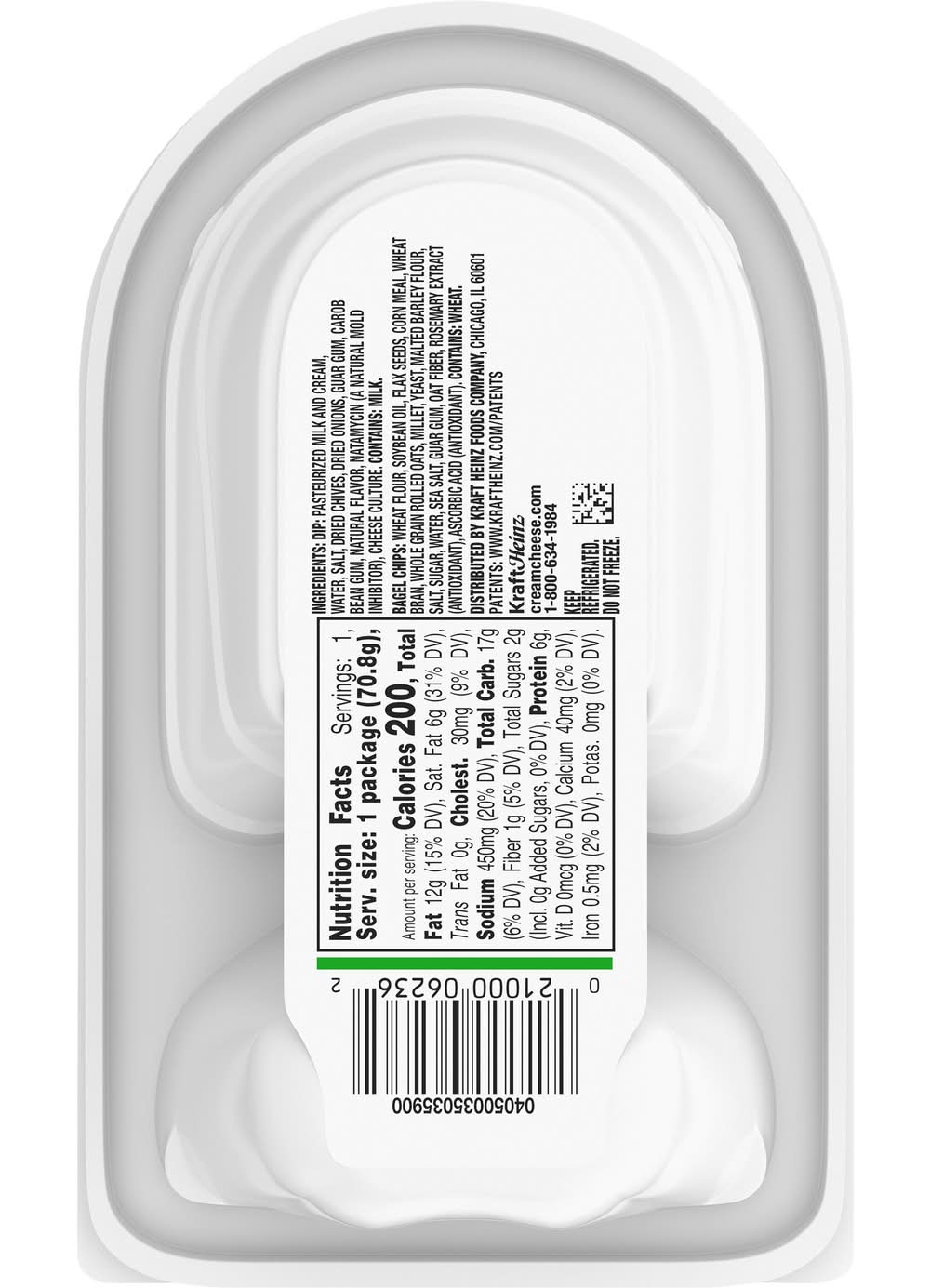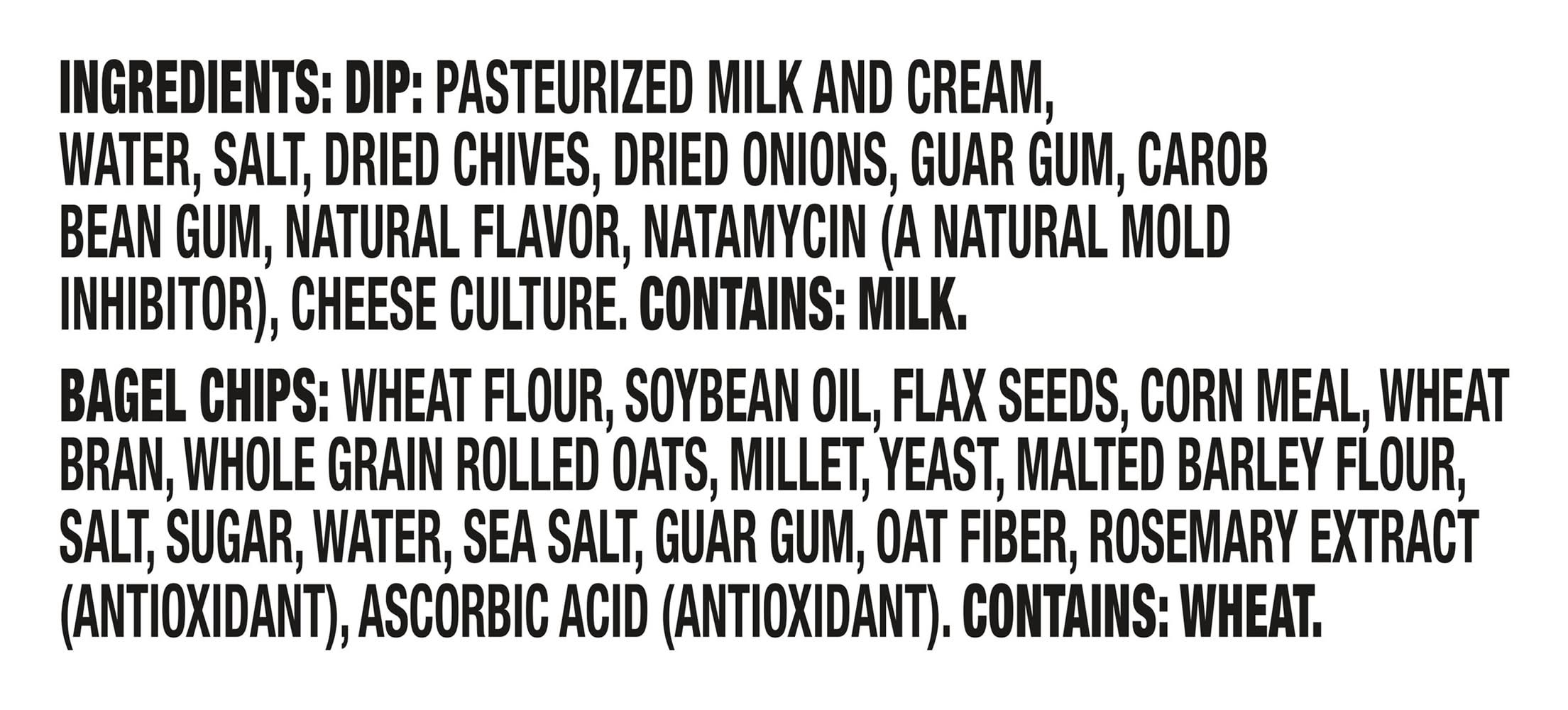 Ingredients: DIP: PASTEURIZED MILK AND CREAM, WATER, SALT, DRIED CHIVES, DRIED ONIONS, GUAR GUM, CAROB BEAN GUM, NATURAL FLAVOR, NATAMYCIN (A NATURAL MOLD INHIBITOR), CHEESE CULTURE. CONTAINS: MILK.BAGEL CHIPS: WHEAT FLOUR, SOYBEAN OIL, FLAX SEEDS, CORN MEAL, WHEAT BRAN, WHOLE GRAIN ROLLED OATS, MILLET, YEAST, MALTED BARLEY FLOUR, SALT, SUGAR, WATER, SEA SALT, GUAR GUM, OAT FIBER, ROSEMARY EXTRACT (ANTIOXIDANT), ASCORBIC ACID (ANTIOXIDANT), . CONTAINS: WHEAT. Contains: CONTAINS: MILK, WHEAT.
