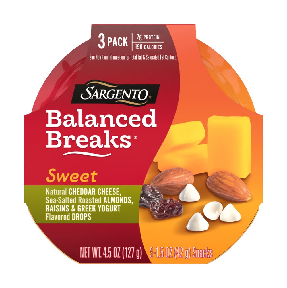 It’s good to give yourself a break — at the office, at school and at home. In fact, we think you deserve it. So kick back and enjoy a Sargento® Sweet Balanced Breaks® Natural Cheddar Cheese, Sea-Salted Roasted Almonds, Raisins and Greek Yogurt Flavored Drops snack. This indulgent little snack kit includes rich, buttery Natural Cheddar Cheese, deliciously sweet, chewy raisins, smooth, creamy Greek yogurt flavored drops and crunchy, salty, satisfying almonds. Take a break, grab a snack, get back out there and win the rest your day. From a third-generation, family-owned company. Sargento Foods Inc., One Persnickety PlacePlymouthWI, 53073