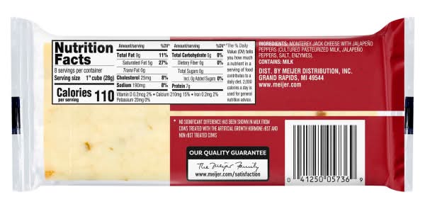 Meijer Chunk Monterey Pepper Jack Cheese is available in chunk form, making it easy to slice for versatile culinary uses. Infused with jalapeno peppers, the cheese offers a slightly spicy flavor profile. It is well-suited for stacking on crackers or incorporating into quesadillas.