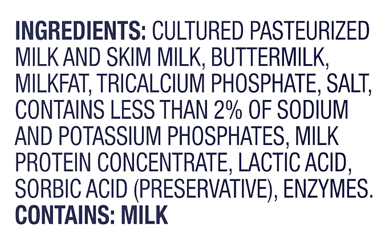 Ingredients: Cultured Pasteurized Milk and Skim Milk, Buttermilk, Milkfat, Tricalcium Phosphate, Salt, Contains Less than 2% of Sodium and Potassium Phosphates, Milk Protein Concentrate, Lactic Acid, Sorbic Acid (Preservative), Enzymes Contains: Milk