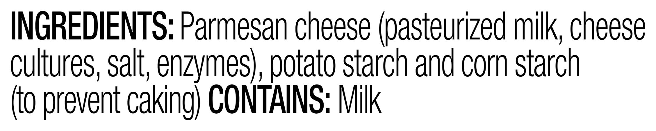 Ingredients: Parmesan Cheese (Pasteurized Milk, Cheese Cultures, Salt, Enzymes), Potato Starch and Corn Starch (to Prevent Caking) Contains: Milk, Corn