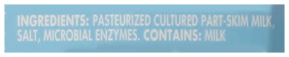 Ingredients: Pasteurized Cultured Part-Skim Milk, Salt, Microbial Enzymes. Contains: Milk