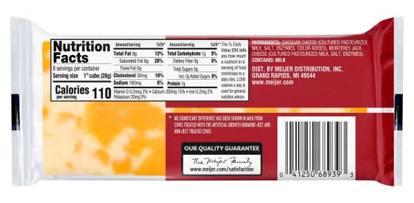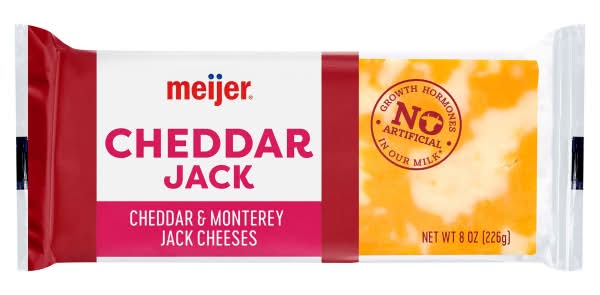 Meijer Chunk Cheddar Jack Cheese comes in a chunk form and is used in culinary preparations including charcuterie boards and queso. It features a balanced blend of sharp and mellow flavors, making it suitable for topping off meals.