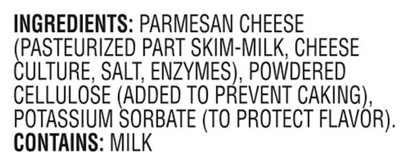 Ingredients: Parmesan Cheese (Pasteurized Part Skim-milk, Cheese Culture, Salt, Enzymes), Powdered Cellulose (Added to Prevent Caking), Potassium Sorbate (to Protect Flavor) Contains: Contains: Milk