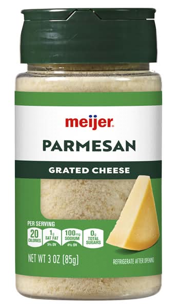 Whether youre making tasty pasta or cooking up a delicious chicken parmesan, Meijer Grated Parmesan Cheese is full of mild, mouthwatering flavor in every serving. Use it to top off simply superb side dishes like savory mashed potatoes or add it to a yummy soup for an extra ounce of creamy flavor.