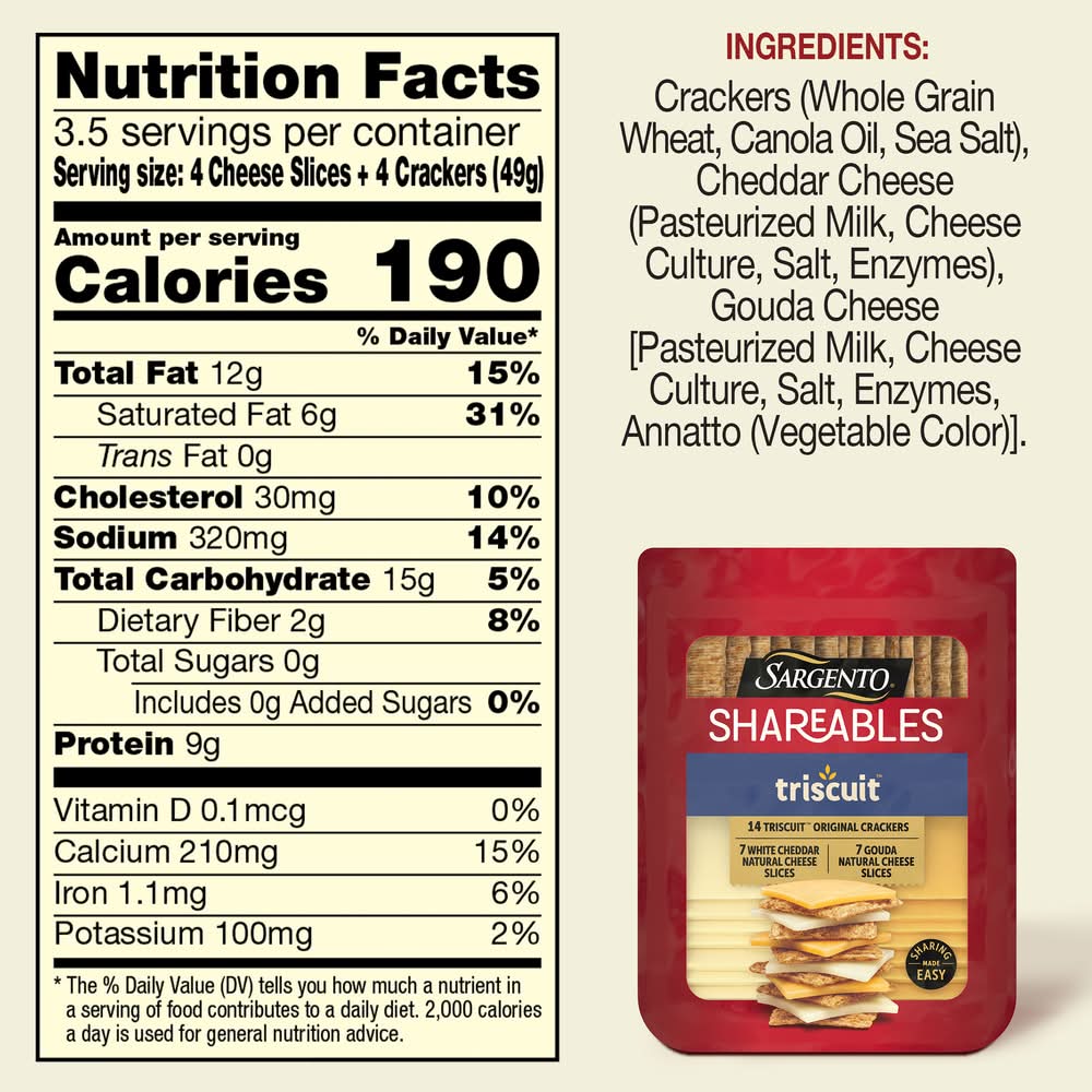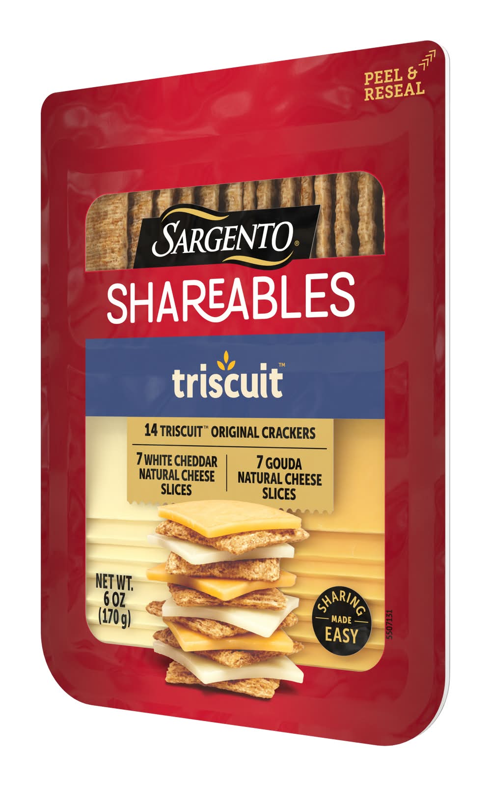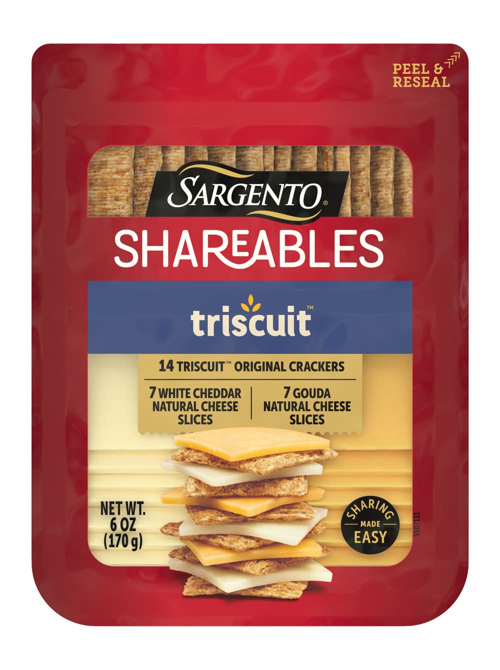 Introducing Sargento® Shareables with 14 Triscuit® Original Crackers, 7 White Cheddar Natural Cheese Slices, & 7 Gouda Natural Cheese Slices, the ideal snack pack for sharing! This delicious duo combines 14 Triscuit® Original Crackers with two varieties of Sargento® natural cheeses — 7 slices of mild, creamy Gouda and 7 slices of sharp, nutty white cheddar. The resealable tray helps ensure freshness, making it easy to enjoy anytime. Whether you're looking for a quick after-school bite or a simple appetizer for a gathering, this combo offers the perfect balance for easy sharing. For 3 generations, the Sargento family has proudly delivered high-quality, real, natural cheese you can trust. TRISCUIT® is a trademark of Mondelez International group, used under license.