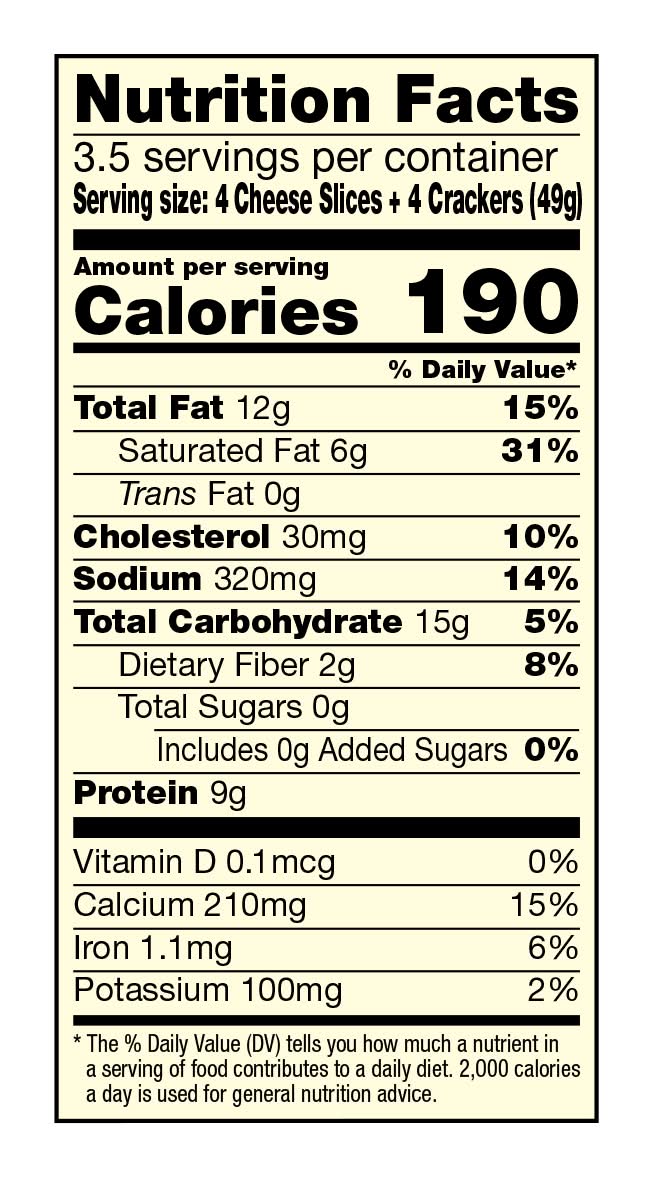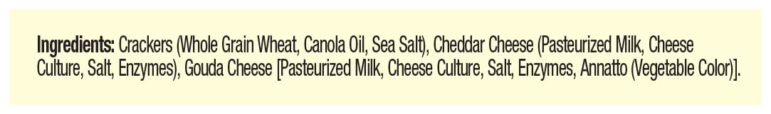 Ingredients: Crackers (Whole Grain Wheat, Canola Oil, Sea Salt), Cheddar Cheese (Pasteurized Milk, Cheese Culture, Salt, Enzymes), Gouda Cheese [Pasteurized Milk, Cheese Culture, Salt, Enzymes, Annatto (Vegetable Color)], .