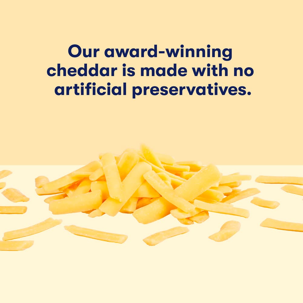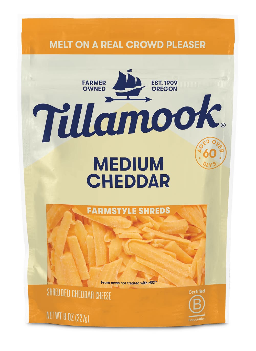 Take home a meltier cheese with award-winning Tillamook Farmstyle Thick Cut Medium Cheddar Shredded Cheese that is cut thicker from the block. Featuring a creamy and full flavor, this thick cut cheddar shredded cheese is perfectly rich and melty. Smooth, and never dull, this aged cheddar cheese tastes better and bolder because it's been aged with time, not shortcuts. Full of flavor, this medium shredded cheddar cheese is sure to be a crowd-pleaser with family and friends. Perfect for making omelets, enchiladas, casseroles or for a yummy, quick cheese snack on the go, this cheddar cheese combines flavor and convenience. The possibilities are endless with this Tillamook Shredded Cheesewhether you're making macaroni and cheese, a yellow cheese sauce or loaded potatoes. Halal Certified, pasteurized and made from high-quality milk from cows not treated with rBST*, this Tillamook Cheese never includes artificial flavors or preservatives. Better yet, you can be assured that each purchase you make of this medium shredded cheese helps support Tillamook in their pursuit to do right. As a Certified B Corp, Tillamook is committed to being good stewards of cows and farms, of people and products, their communities and the environment. With over 110 years of quality cheese-making experience backing them, Tillamook Medium Cheddar Shreds have a taste to remember. Do Right By Every Bite.*The FDA has stated that no significant difference has been shown between milk derived from rBST treated and non-rBST treated cows.
