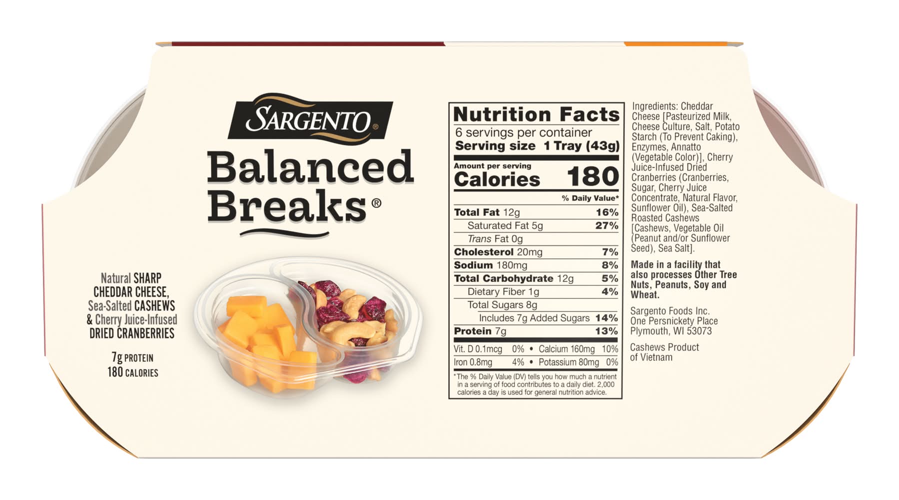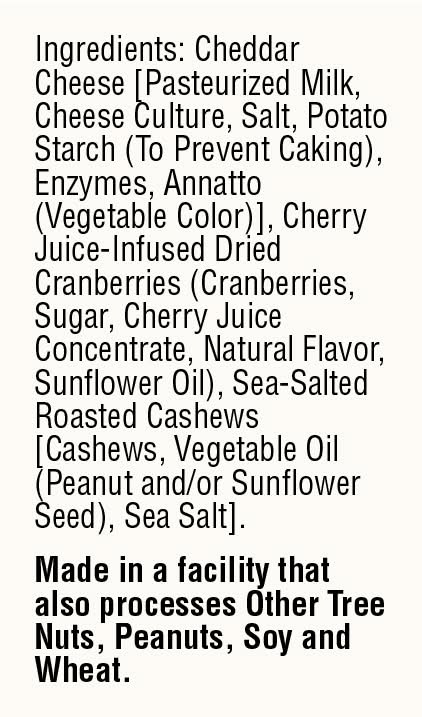 Ingredients: Cheddar Cheese [Pasteurized Milk, Cheese Culture, Salt, Potato Starch (To Prevent Caking), Enzymes, Annatto(Vegetable Color)], Cherry Juice-Infused Dried Cranberries (Cranberries, Sugar, Cherry Juice Concentrate, Natural Flavor,Sunflower Oil), Sea-Salted Roasted Cashews [Cashews, Vegetable Oil (Peanut and/or Sunflower Seed), Sea Salt], . Contains: Made in a facility that also processes Other Tree Nuts, Peanuts, Soy and Whea