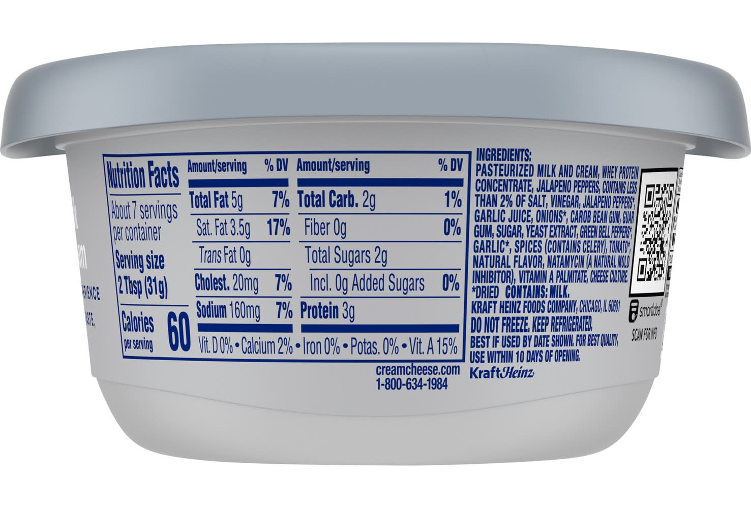 Ingredients: Pasteurized Milk and Cream, Whey Protein Concentrate, Jalapeno Peppers, Contains Less than 2% of Salt, Vinegar, Jalapeno Peppers (Dried), Garlic Juice, Onions (Dried), Carob Bean Gum, Guar Gum, Sugar, Yeast Extract, Green Bell Peppers (Dried), Garlic (Dried), Spices (Contains Celery), Tomato (Dried), Natural Flavor, Natamycin (a Natural Mold Inhibitor), Vitamin A Palmitate, Cheese Culture Contains: Milk, Celery