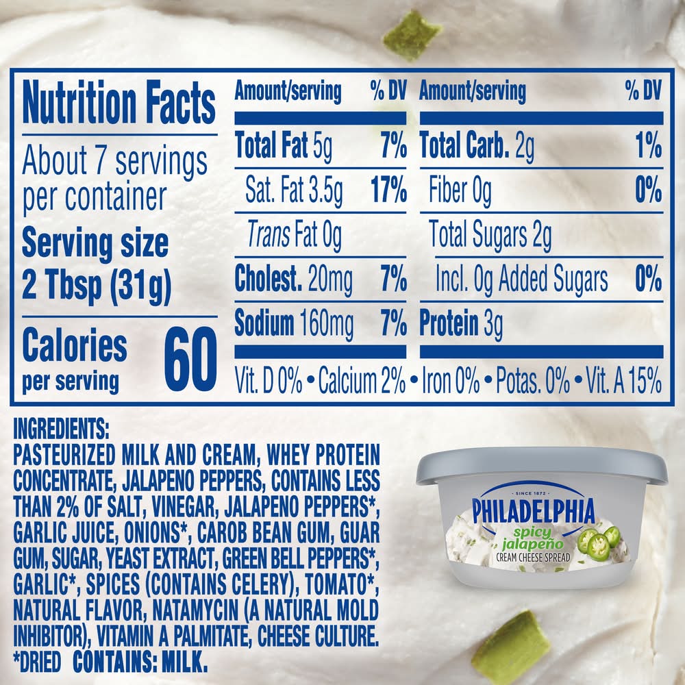 Dive into immersive pleasure with Philadelphia Spicy Jalapeño Cream Cheese Spread. Made with fresh milk, real cream and spicy jalapeños for a multi-dimensional taste that adds a kick to meals and snacks. At Philly, we leave out the artificial preservatives, flavors and dyes to ensure a rich, quality flavor. Our spicy cream cheese spread is easy to spread, making it the perfect choice for adding to your morning bagel or as an ingredient in your favorite homemade dip recipe. Keep our 7.5 ounce resealable container of cream cheese spread refrigerated. With Philadelphia Cream Cheese Spread, enjoy a rich, creamy experience you don't just taste, you feel. • Flavor: Spicy jalapeno • Packaging: Reusable