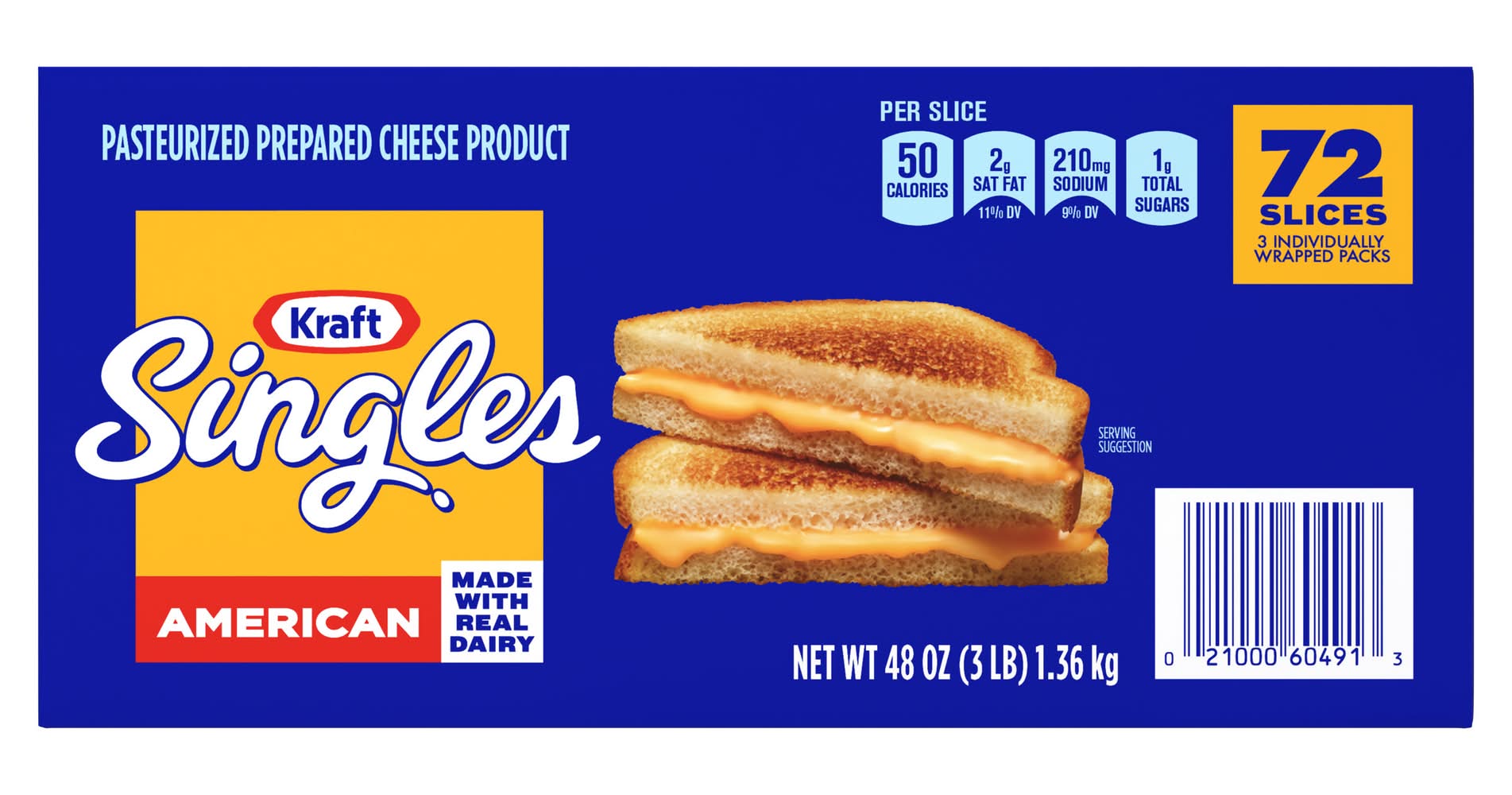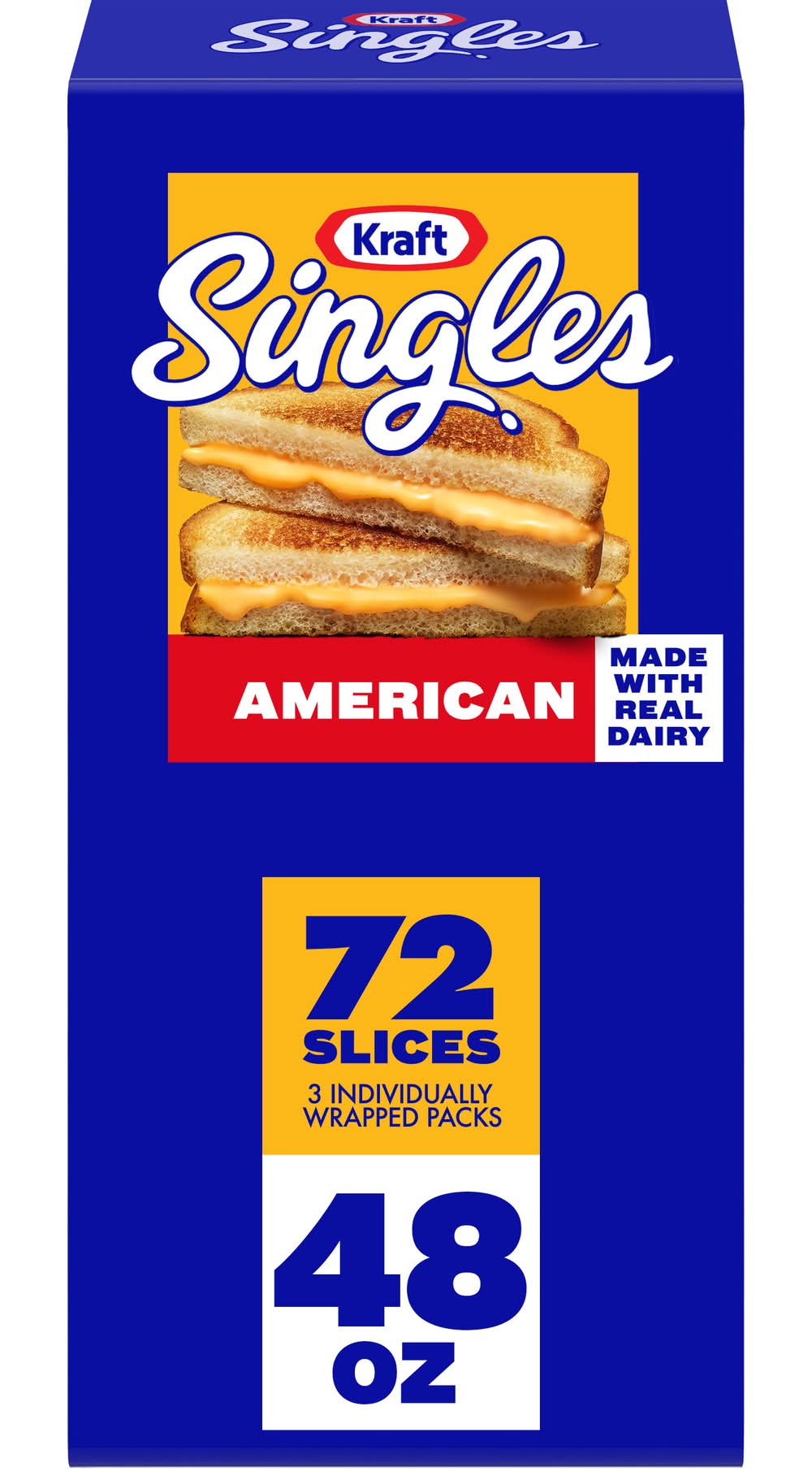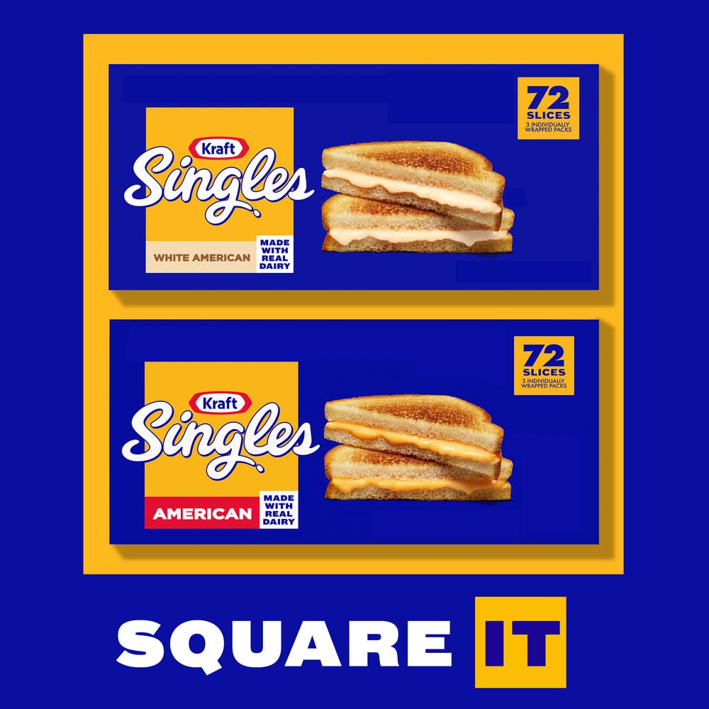 Delicious any way you square it, Kraft Singles American Slices deliver the classic American taste and irresistible melt that take your favorite summer grilling foods to the next level. Made with real dairy and no artificial flavors, our singles have a mild, savory flavor and smooth, creamy texture thats perfectly melty. Our simple squares are ideal for more than just grilled cheese. Try adding Kraft Singles to your breakfast sandwich, burger or tuna melt. Transform steak and bread into a Philly cheesesteak, put a twist on ramen or turn plain fries into ooey gooey cheese fries. When youre craving classic comfort food, add America's favorite square to your mac and cheese for a simple joy thats sure to make you smile. Kraft Singles American Slices are known for their distinct yellow color and smooth, creamy texture. Kraft Singles American Slices is a versatile cheese product perfect for sandwiches, burgers and grilled cheese, as they melt easily and evenly. Our slices can also be used in recipes such as macaroni and cheese, casseroles and dips. One of the key features of Kraft Singles American Slices is their convenience. They come pre-sliced and individually wrapped, making them easy to use and store. Kraft Singles contain 50 calories per serving. For optimal creamy goodness, keep our large box of 72 slices refrigerated. Our sliced American singles are a great addition to any summer spread for Fourth of July or Labor Day BBQs. Kraft Singles American Slices have been a popular staple in American households for decades. Kraft Heinz Foods Company, Chicago, IL, 60601