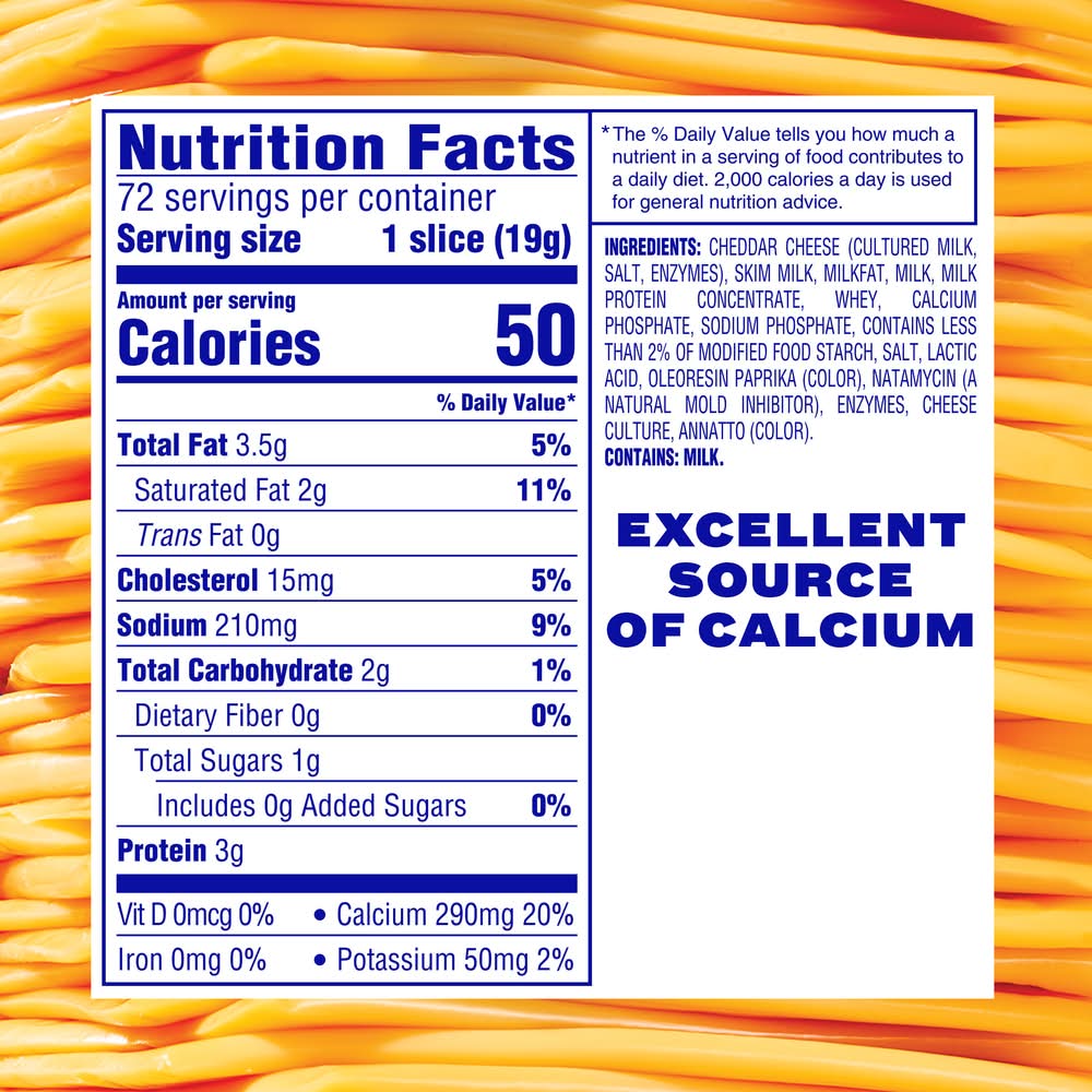 Ingredients: CHEDDAR CHEESE (CULTURED MILK, SALT, ENZYMES), SKIM MILK, MILKFAT, MILK, MILK PROTEIN CONCENTRATE, WHEY, CALCIUM PHOSPHATE, SODIUM PHOSPHATE, CONTAINS LESS THAN 2% OF MODIFIED FOOD STARCH, SALT, LACTIC ACID, OLEORESIN PAPRIKA (COLOR), NATAMYCIN (A NATURAL MOLD INHIBITOR), ENZYMES, CHEESE CULTURE, ANNATTO (COLOR), . Contains: CONTAINS: MILK.