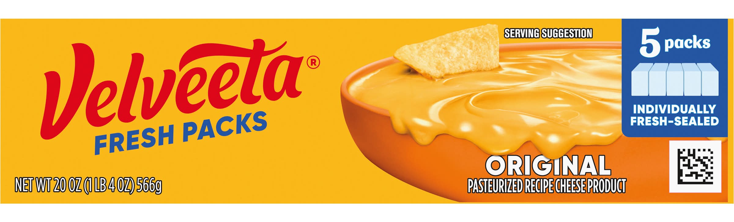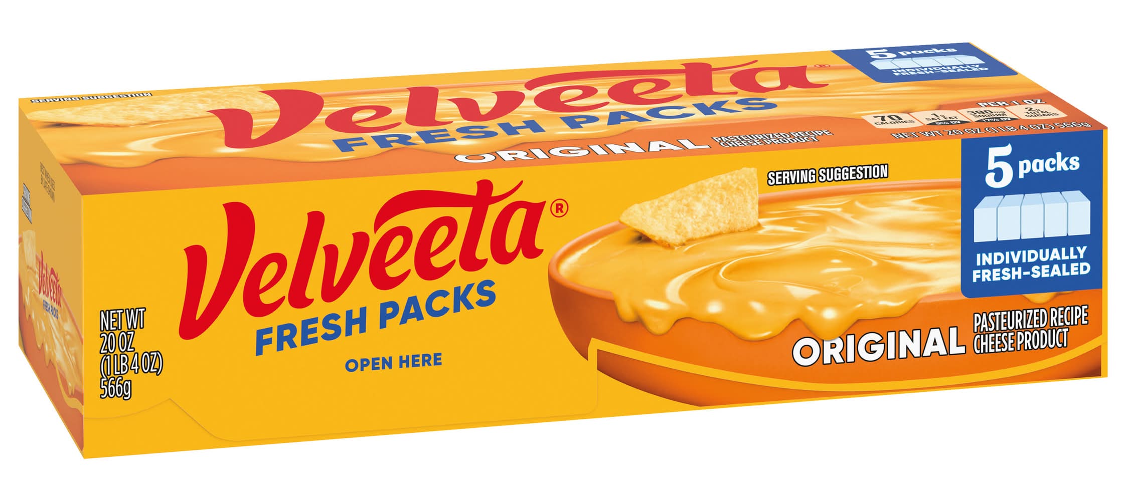 Viva la cheese! Live life to the creamiest with Velveeta Fresh Packs Original Melting Cheese Blocks. Craveable and flavorful, our solid cheese blocks for melting contain real milk. When your drip is as smooth as ours, you don’t waste time when it comes to delicious, melty indulgence. For instant cheesy gratification, carve off a generous slice to melt in a crisp, buttery grilled cheese sandwich. Make your most enviable cheese dip or macaroni and cheese recipe; start a perfectly cheesy soup base or add Velveeta to any side dish, entree or snack worth elevating to icon status. Velveeta’s supremely creamy texture, epic meltability and rich, savory taste satisfy your cravings any day of the week. Sometimes unnecessary is necessary, so kick back, relax and embrace the flavor, unapologetically. Refrigerate our 20 oz box of 5 individually wrapped Velveeta Fresh Packs of cheese after opening to maintain freshness. That’s La Dolce Velveeta! • Number of servings: 20 • Kraft Heinz Foods Company, Chicago, IL, 60601