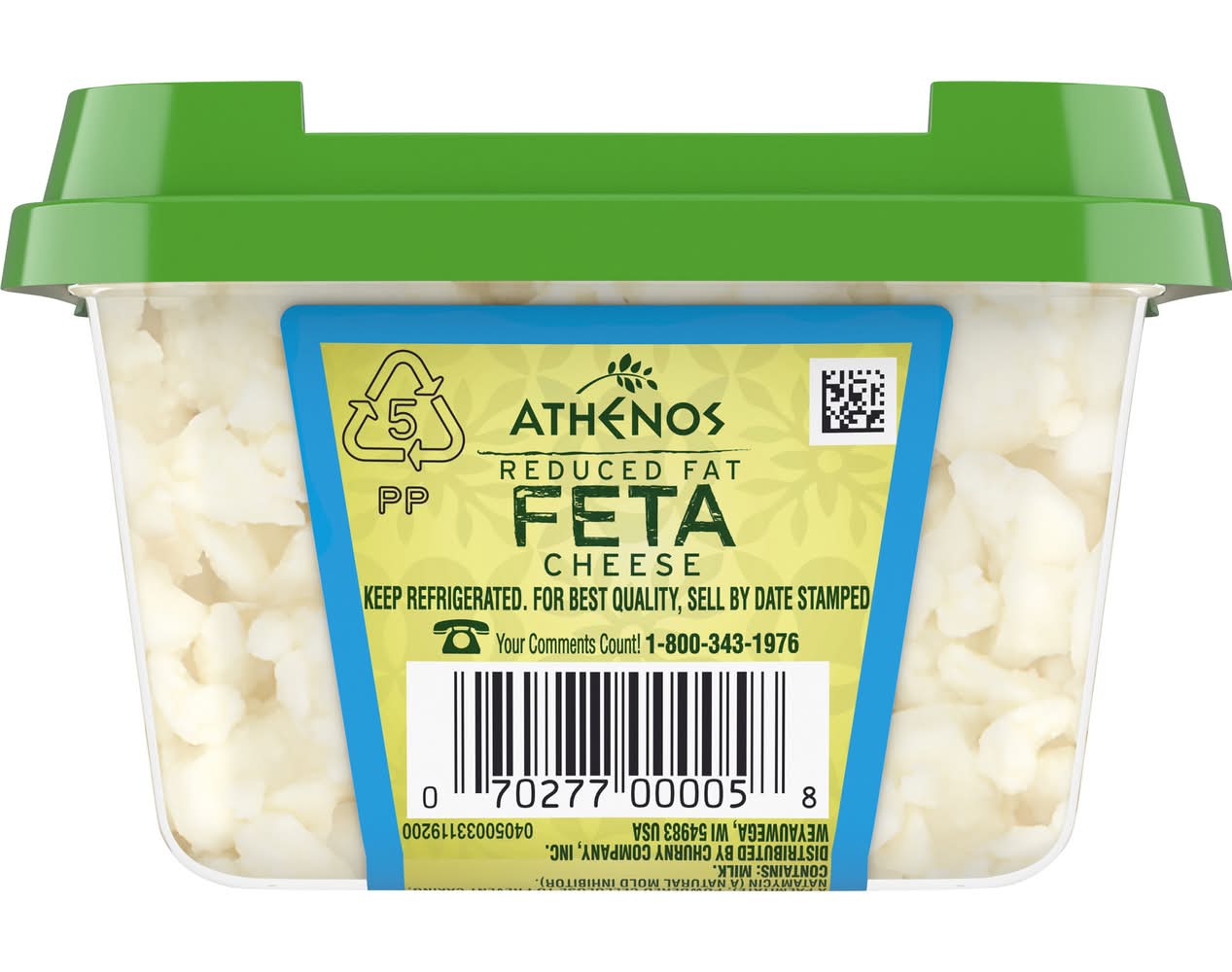 Athenos Reduced Fat Traditional Feta Cheese Crumbles are made simply and with respect for the ingredients. This feta requires extra time and care to create the perfect reduced fat feta with all the same tangy, creamy flavor you love but 1/3 less fat than Athenos Traditional Feta, see nutrition information for saturated fat and sodium content. Made from pasteurized part-skim milk, this reduced fat cheese has 50 calories per 1/4 cup serving. Use these crumbles to create an irresistible stuffed chicken dish, enjoy them as a salad topping, or spread these traditional feta crumbles onto avocado toast for a satisfying afternoon snack. • Flavor: Feta • Emmi Roth USA, Inc., Weyauwega, WI 54983 • Packaging: Reusable