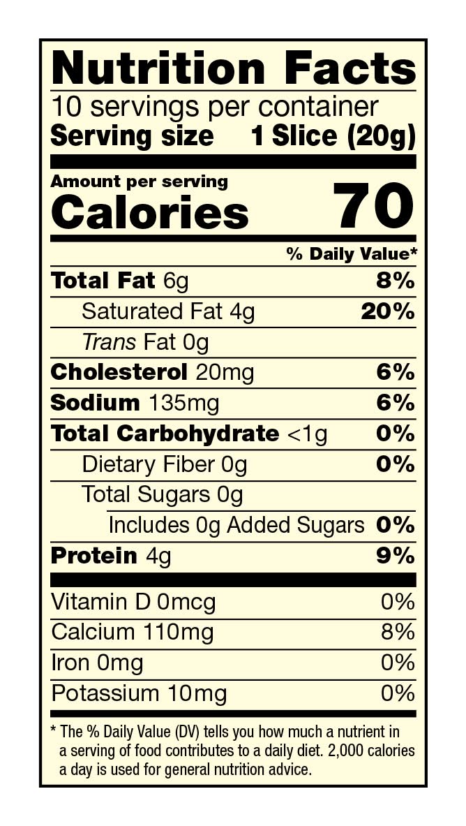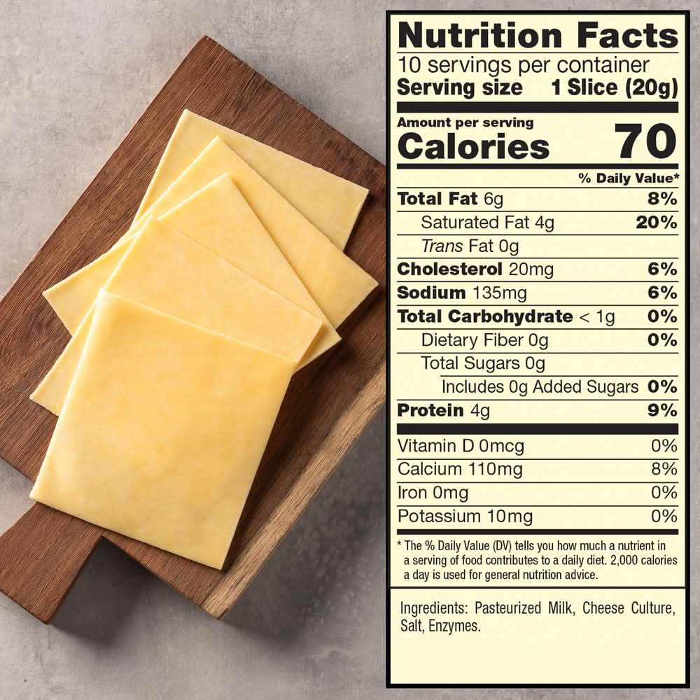 Ingredients: Pasteurized Milk, Cheese Culture, Salt, Enzymes, Annatto (Vegetable Color) Contains: Milk