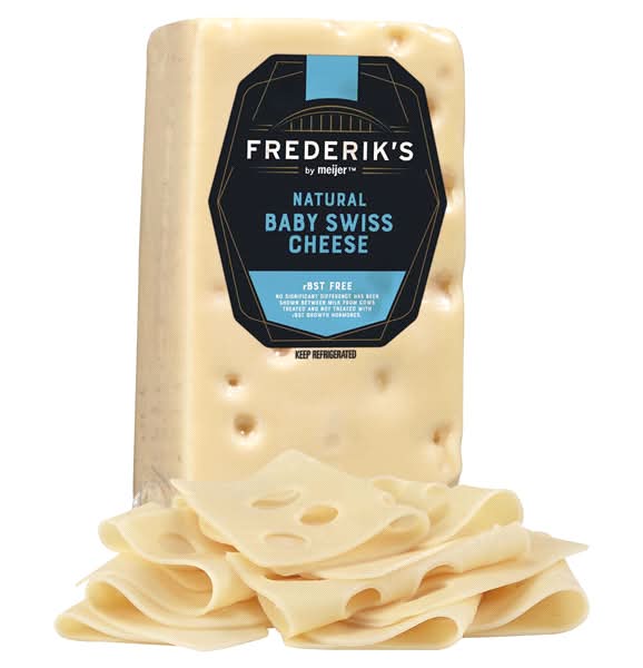 Frederik's by Meijer Baby Swiss Cheese comes in slices, making it a suitable choice for enhancing the flavor of sandwiches and other dishes. This type of Baby Swiss Cheese is crafted to complement a variety of snacks and culinary creations.