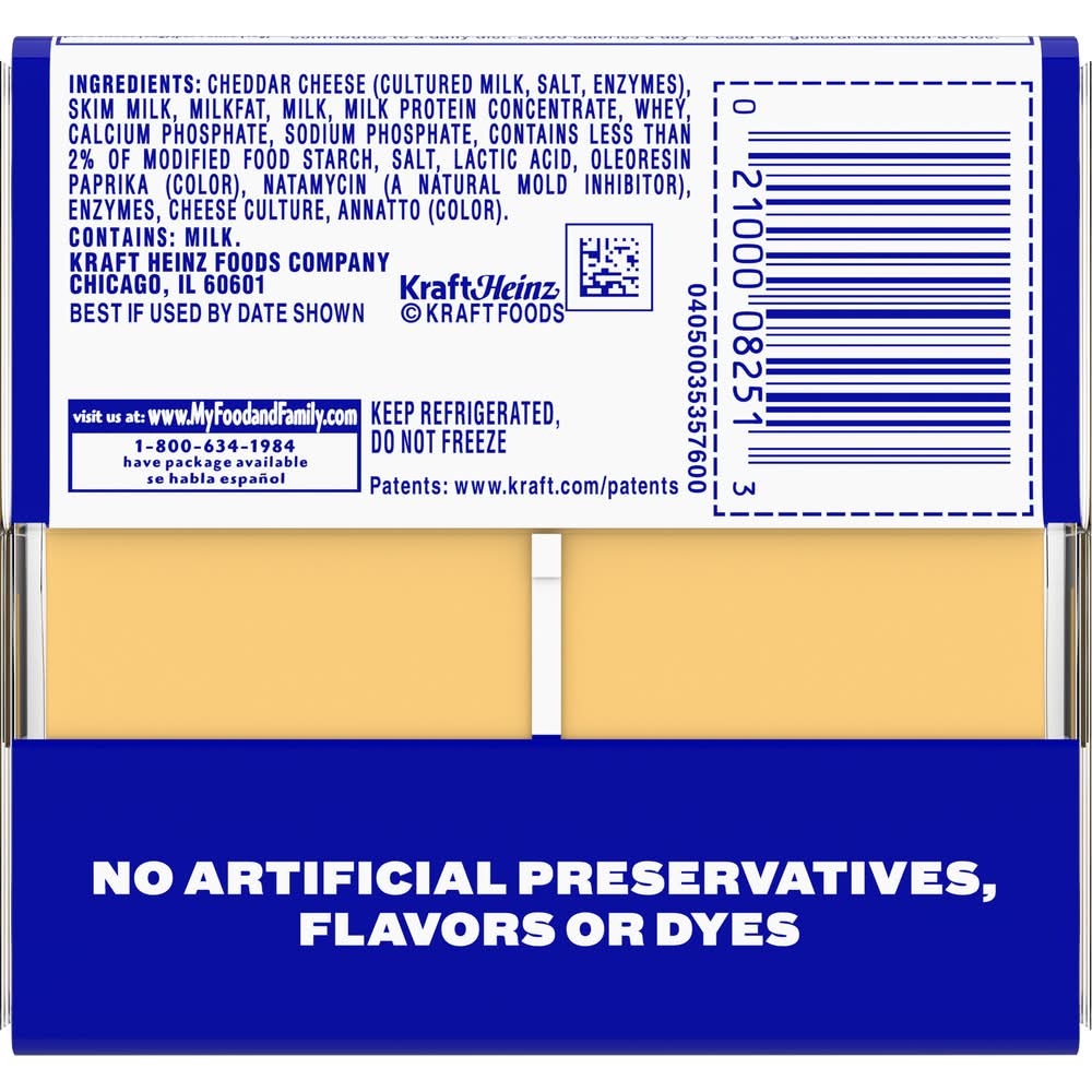 Ingredients: CHEDDAR CHEESE (CULTURED MILK, SALT, ENZYMES), SKIM MILK, MILKFAT, MILK, MILK PROTEIN CONCENTRATE, WHEY, CALCIUM PHOSPHATE, SODIUM PHOSPHATE, CONTAINS LESS THAN 2% OF MODIFIED FOOD STARCH, SALT, LACTIC ACID, OLEORESIN PAPRIKA (COLOR), NATAMYCIN (A NATURAL MOLD INHIBITOR), ENZYMES, CHEESE CULTURE, ANNATTO (COLOR), . Contains: CONTAINS: MILK.