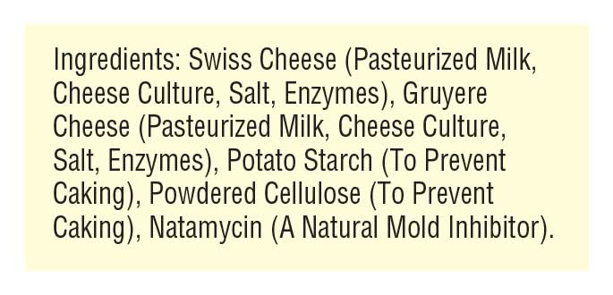 Ingredients: SWISS AND GRUYERE CHEESES (PASTEURIZED MILK, CHEESE CULTURE, SALT, ENZYMES), POTATO STARCH AND POWDERED CELLULOSE (TO PREVENT CAKING), NATAMYCIN (A NATURAL MOLD INHIBITOR), . Contains: 'Milk Contains'