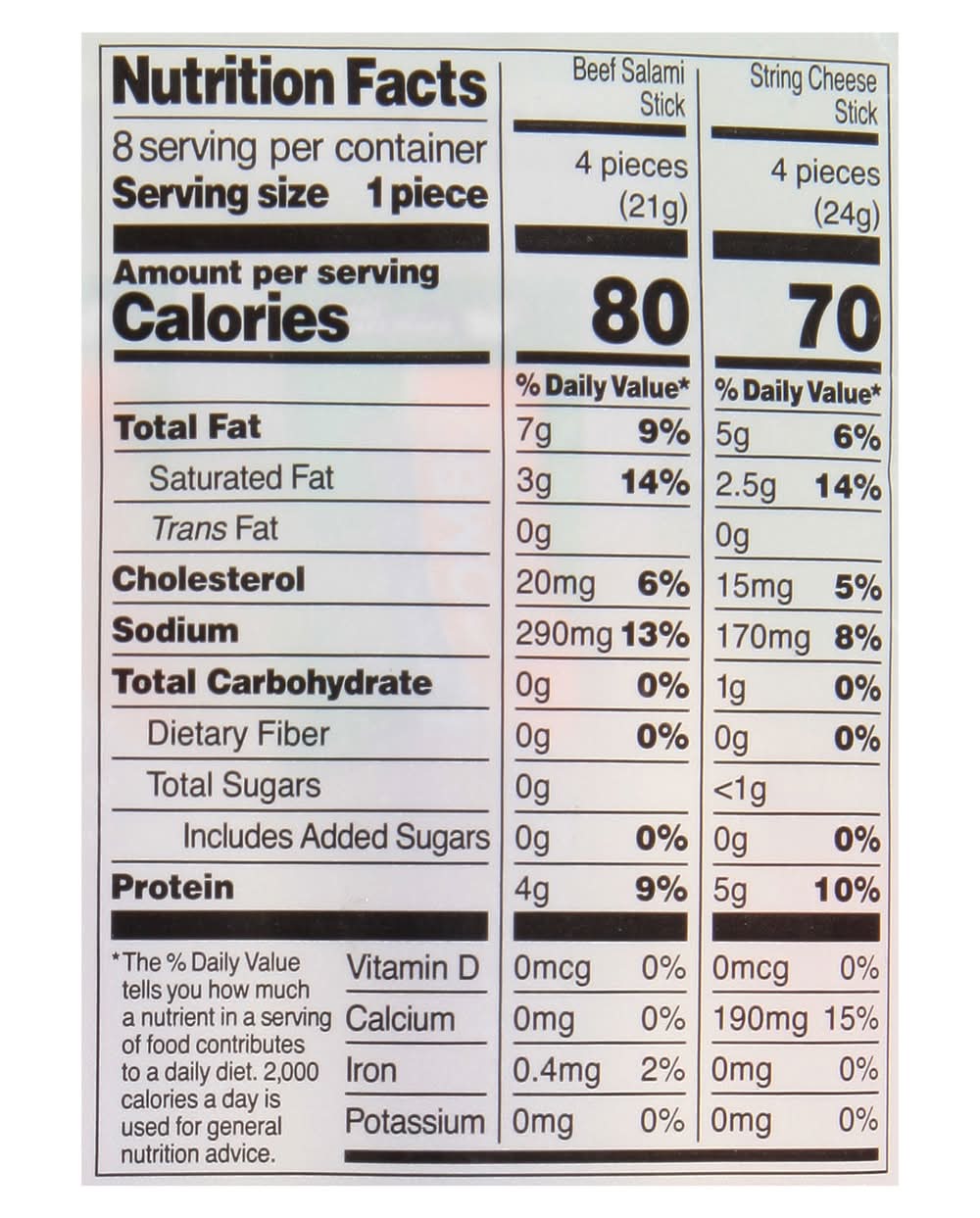 Ingredients: Beef Salami Stick : Beef Salami Stick (Beef, Salt, Contains 2% or Less of: Dextrose, Spices, Lactic Acid Starter Culture, Natural Flavor, Garlic Powder, Sodium Ascorbate, Sodium Nitrite). String Cheese Stick: Low Moisture Part-Skim Mozzarella Cheese (Cultured Pasteurized Part-Skim Milk, Salt, Enzymes). Contains: Milk