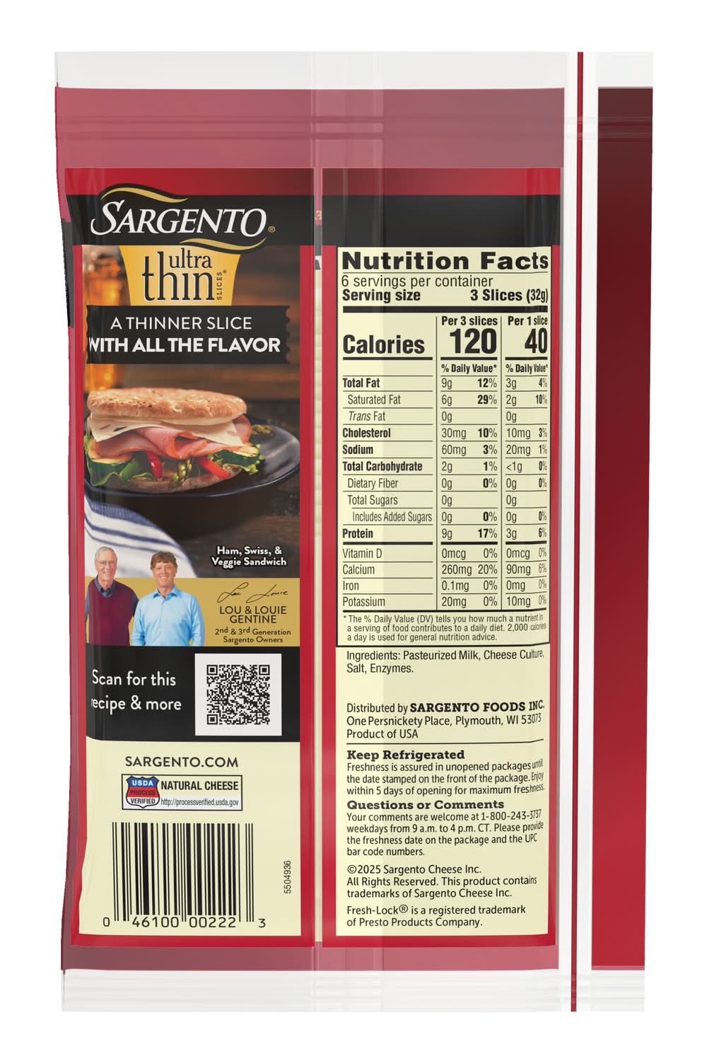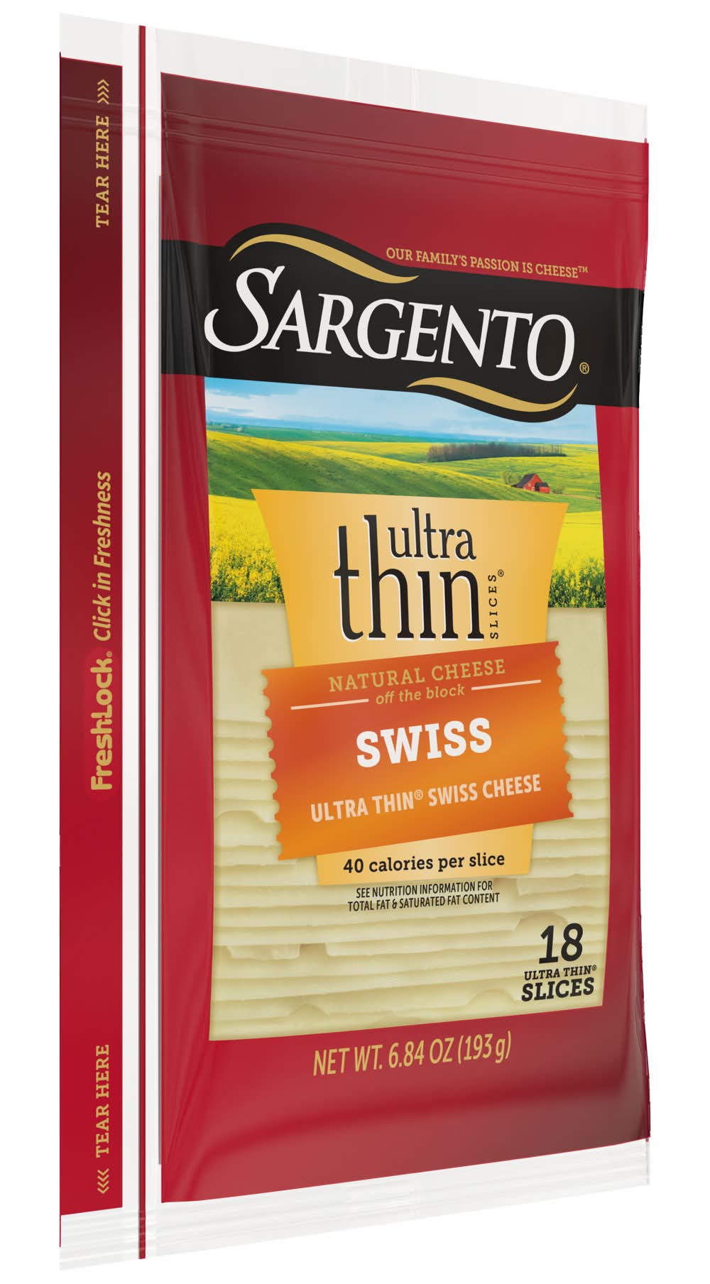 Thinly sliced without sacrificing the signature flavor, this Swiss Natural Cheese adds a deliciously mellow, nutty flavor to sandwiches like Reubens and ham and cheese as well as burgers and all your favorite wraps and paninis. This convenient packaged cheese is ideal for packing in the cooler for tailgate parties, picnics and road trips. Easy-close Fresh Lock packaging helps keep cheese fresh longer, but use within five days upon opening for maximum freshness. Sargento Foods Inc., One Persnickety Place, Plymouth, WI, 53073