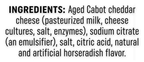 Ingredients: Aged Cabot cheddar cheese (pasteurized milk, cheese cultures, salt, enzymes), sodium citrate (an emulsifier), salt, citric acid, natural and artificial horseradish flavor Contains: Milk