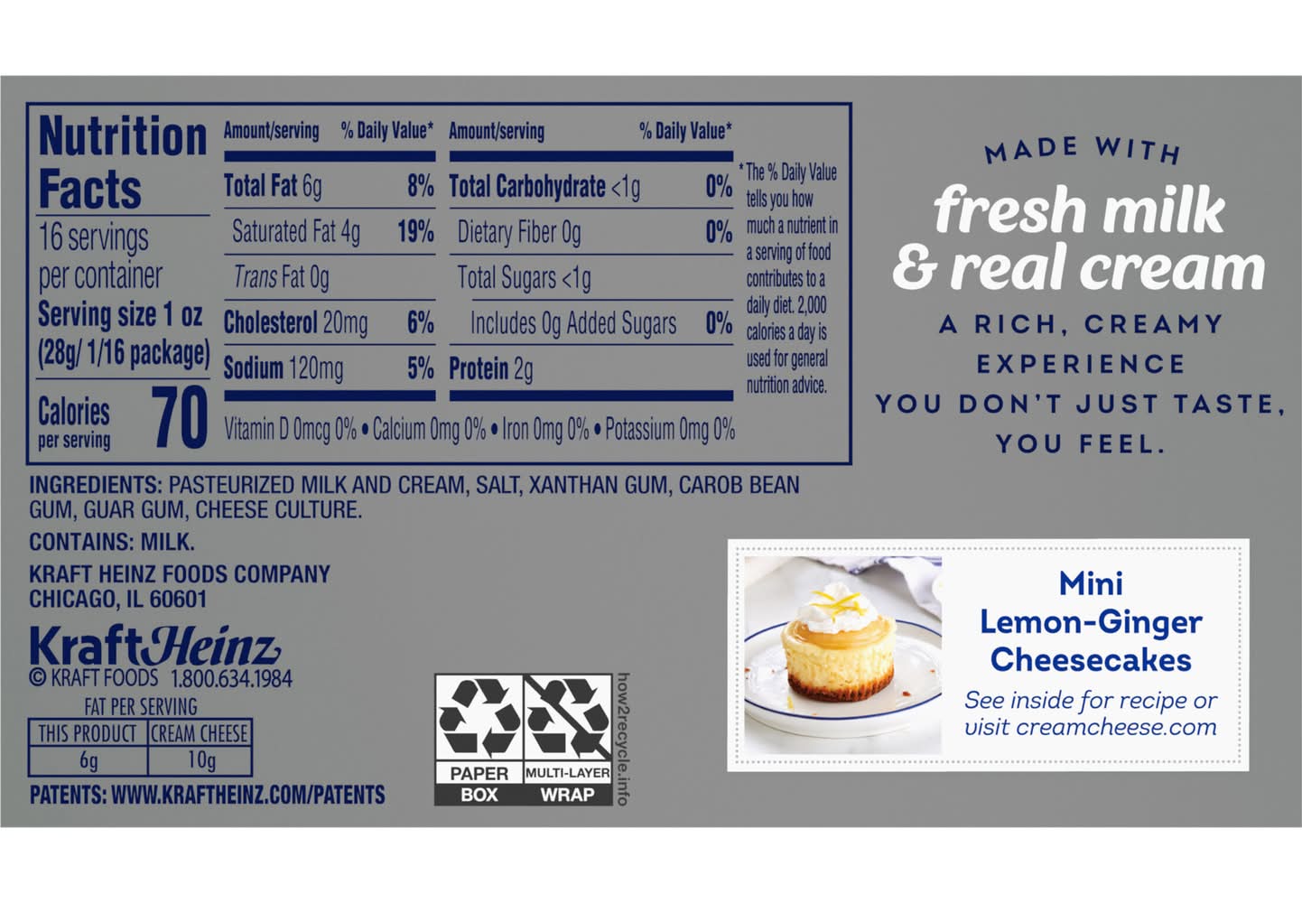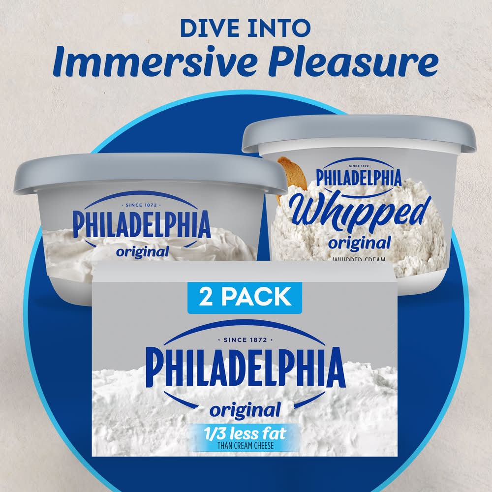 Dive into immersive pleasure with Philadelphia Neufchatel Cheese with 1/3 Less Fat than Cream Cheese. Made with fresh milk and real cream for an extra creamy, multi-dimensional taste you can add to any meal. At Philly, we leave out the preservatives to ensure a rich, quality flavor. Containing 1/3 the fat of our original cream cheese, Philadelphia is easy to use in baking, making it the perfect choice for adding to your favorite cheesecake recipe or using as an ingredient in frosting. Stock up with our 2 pack of 8 ounce neufchatel cheese blocks and make sure to keep them refrigerated. With Philadelphia Neufchatel Cheese, enjoy a rich, creamy experience you don't just taste, you feel.