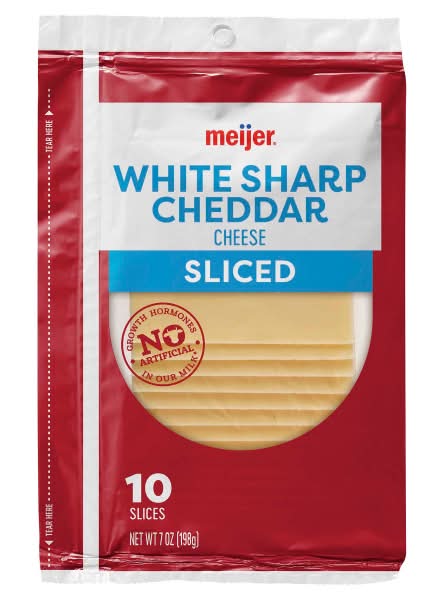 Meijer White Sharp Cheddar Cheese is available sliced, offering a rich, nutty flavor that is both bold and creamy. It is suitable for use in sandwiches and pairs well with crackers, known for its aromatic characteristics.