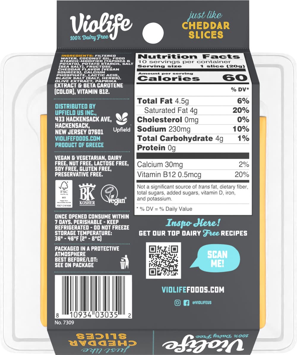 A sandwich is more than a sandwich. Its a love letter from you to your heart (and your stomach). And, when you have the best ingredients at your fingertips, it becomes a form of self-expression. So let your culinary creativity take flight with Violifes Cheddar Slices, which deliver that craveable cheesy experience but without any dairy, lactose, gluten, soy, nuts, preservatives. So go wildyour sandwich options know no limits. Heres a riddlewhat is a burger? The answer? Incomplete. Yes, that plain burger may have the bun and mustard, but what it really needs is that triumphant slice of yellow cheddar to reach its full potential. Violife can help you upgrade that boring burger with our 100% dairy-free Just Like Cheddar Slices, whether youre vegan, lactose-sensitive or just want to try something new. Place it on your patty, watch it ooze and melt, and we guarantee your mouth will water. Upfield Us Inc, 433 Hackensack Ave,Hackensack,NJ,07601