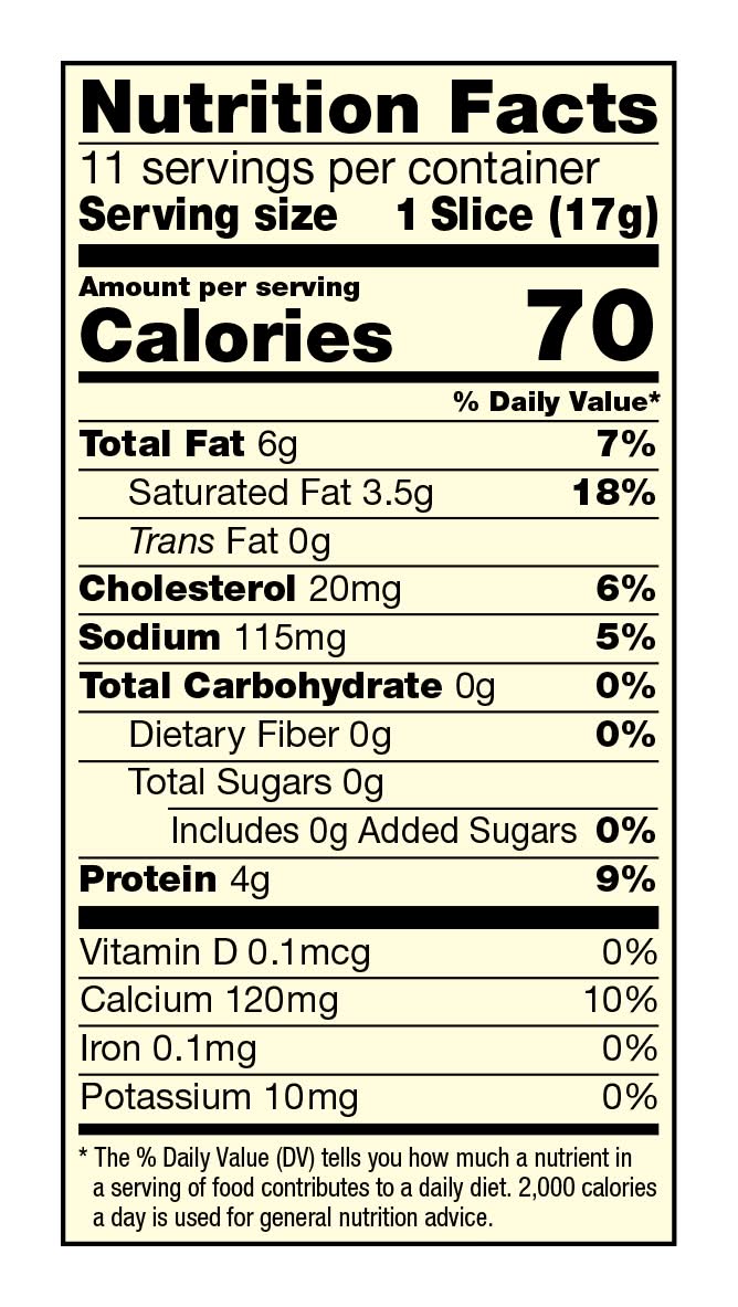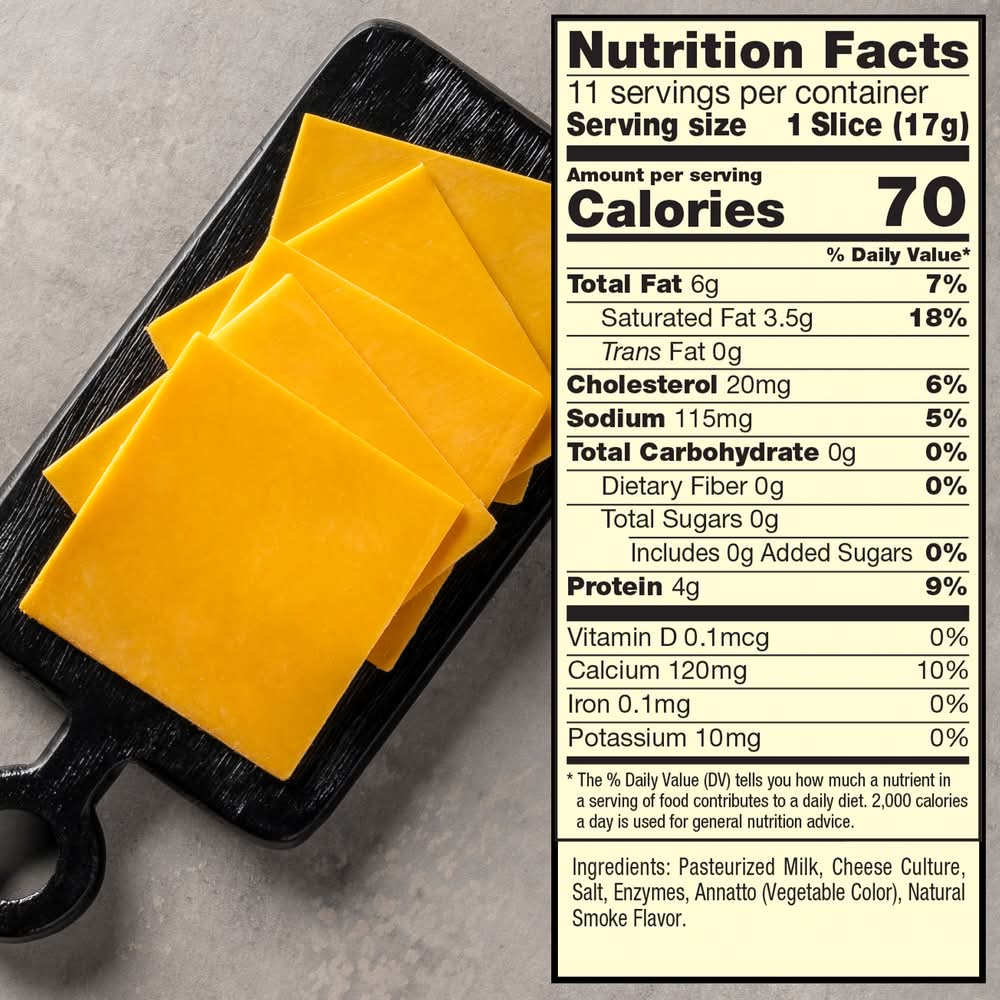 Ingredients: PASTEURIZED MILK, CHEESE CULTURE, SALT, NATURAL SMOKE FLAVOR, ENZYMES, ANNATTO (VEGETABLE COLOR), . Contains: Milk