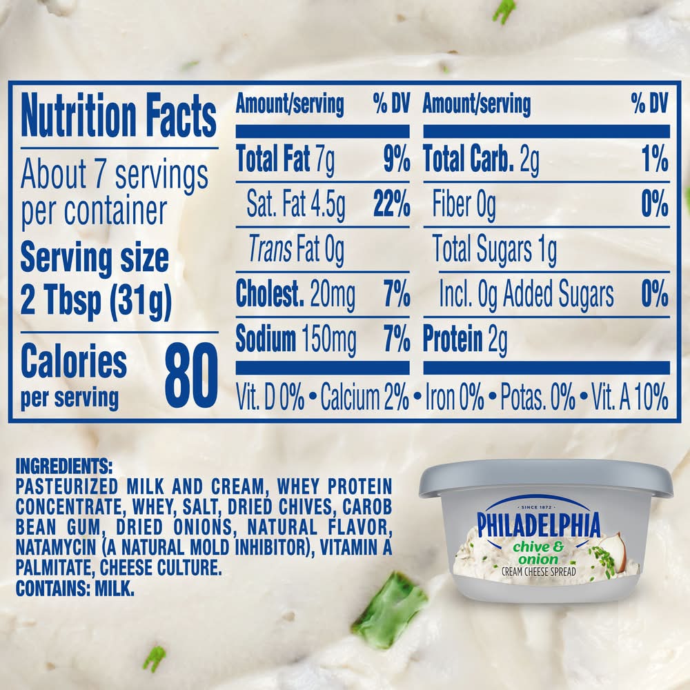 Ingredients: PASTEURIZED MILK AND CREAM, WHEY PROTEIN CONCENTRATE, SALT, DRIED CHIVES, DRIED ONION, CAROB BEAN GUM, GUAR GUM, NATURAL FLAVOR, NATAMYCIN (A NATURAL MOLD INHIBITOR), VITAMIN A PALMITATE, CHEESE CULTURE. Contains: CONTAINS: MILK.