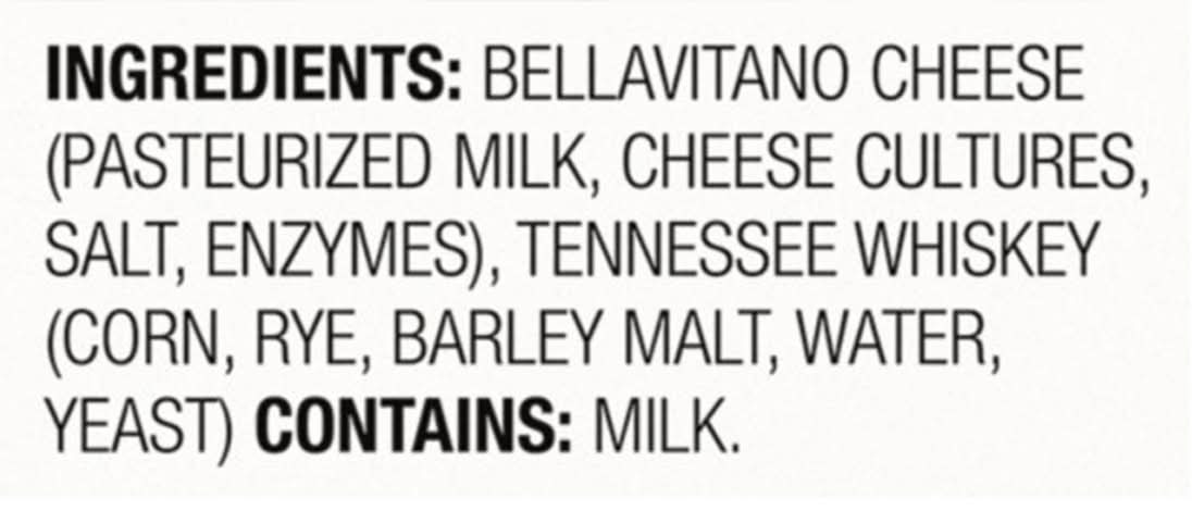 Ingredients: BellaVitano Cheese (Pasteurized Milk, Cheese Cultures, Salt, Enzymes), Tennessee Whiskey (Corn, Rye, Barley Malt, Water, Yeast) Contains: Milk, Corn, Barley