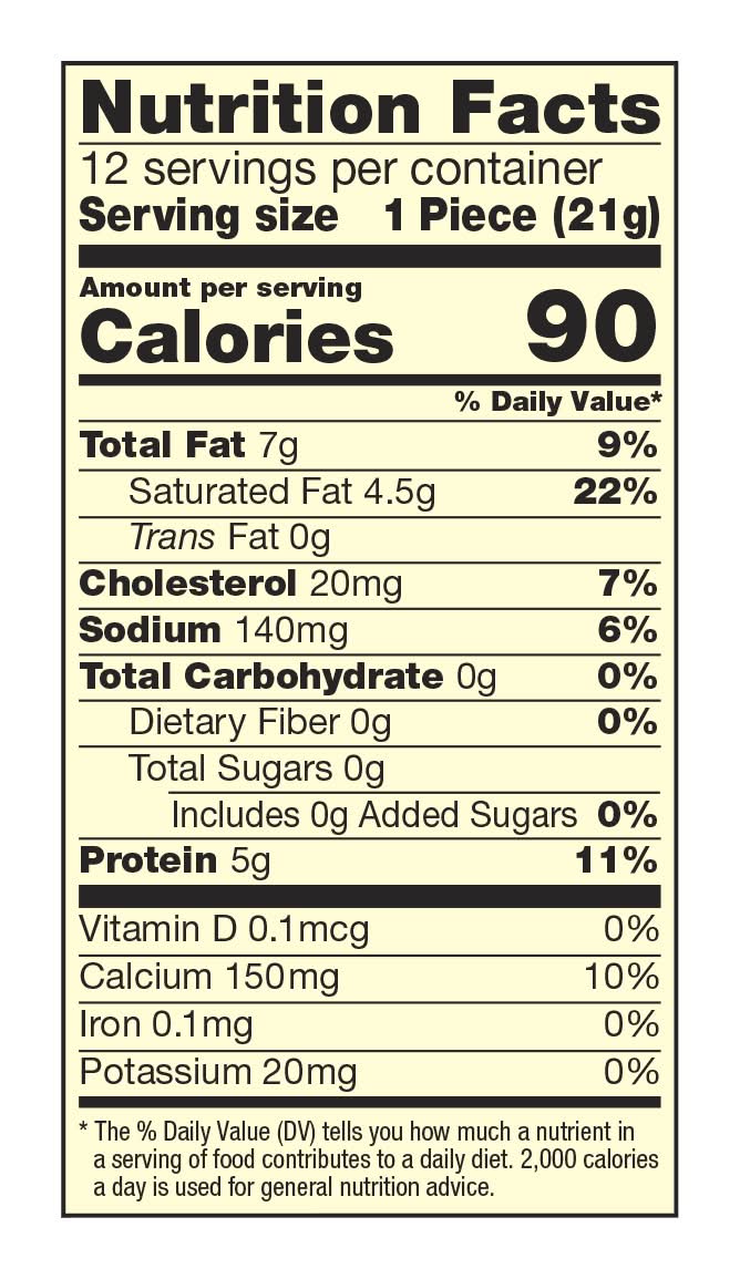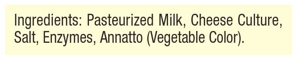 Ingredients: Pasteurized Milk, Cheese Culture, Salt, Enzymes, Annatto (Vegetable Color), . Contains: Milk