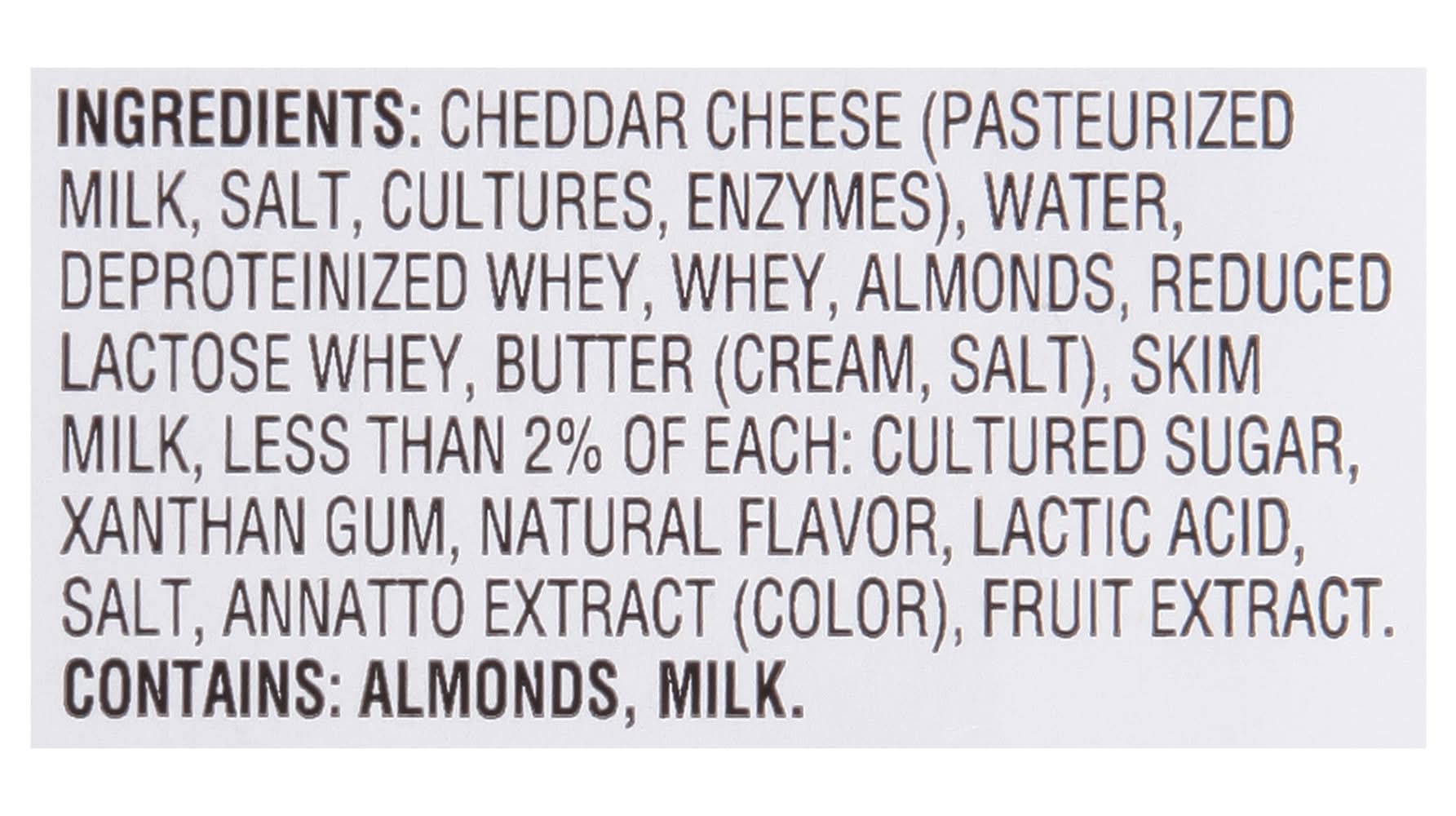 Ingredients: Cheddar Cheese (Pasteurized Milk, Salt, Cultures, Enzymes), Water, Deproteinized Whey, Whey, Almonds, Reduced Lactose Whey, Butter (Cream, Salt), Skim Milk, Less than 2% of Each: Cultured Sugar, Xanthan Gum, Natural Flavor, Lactic Acid, Salt, Annatto Extract (Color), Fruit Extract Contains: Tree Nuts, Almonds, Milk, Lactose