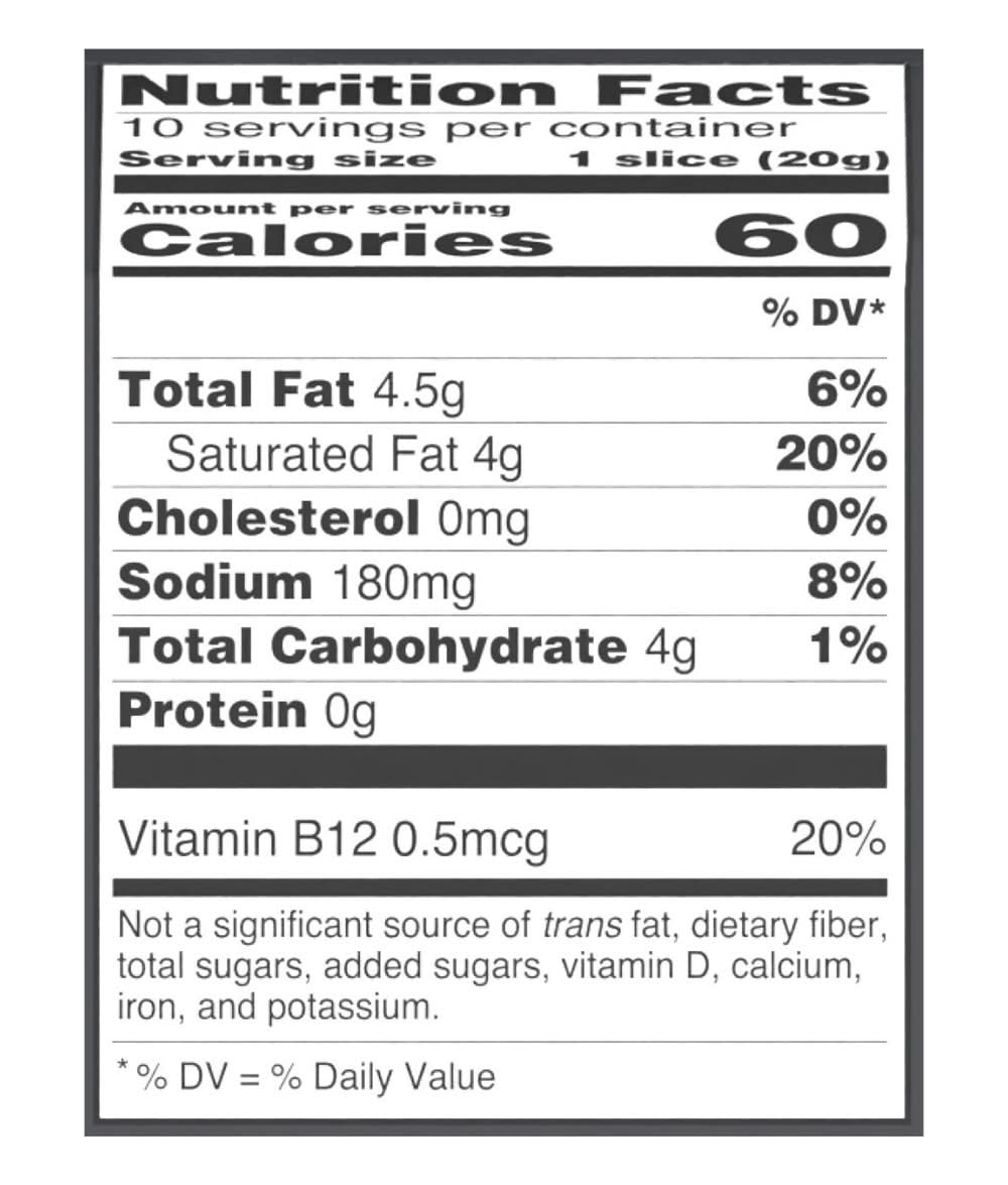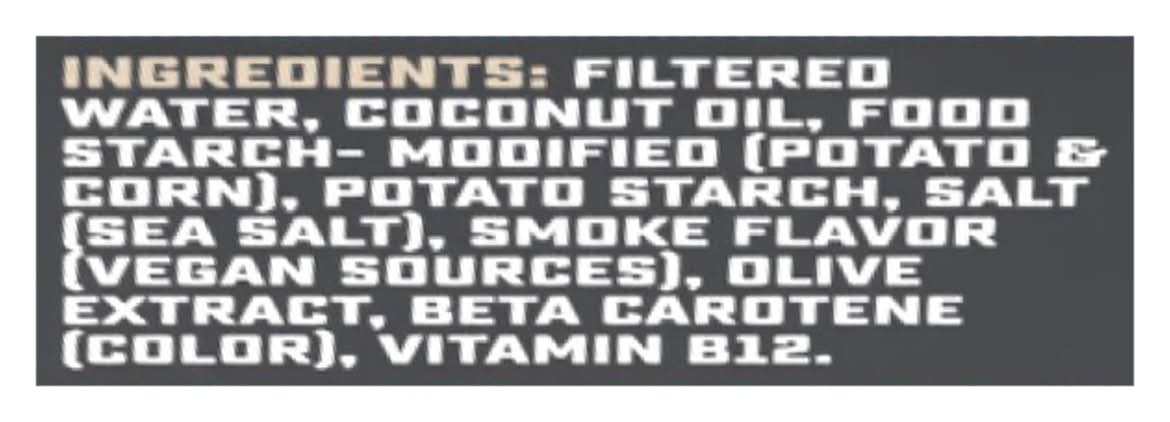 Ingredients: Filtered Water, Coconut Oil, Food Starch-Modified (Potato & Corn), Potato Starch, Salt (Sea Salt), Smoke Flavor (Vegan Sources), Olive Extract, Beta Carotene (Color), Vitamin B12