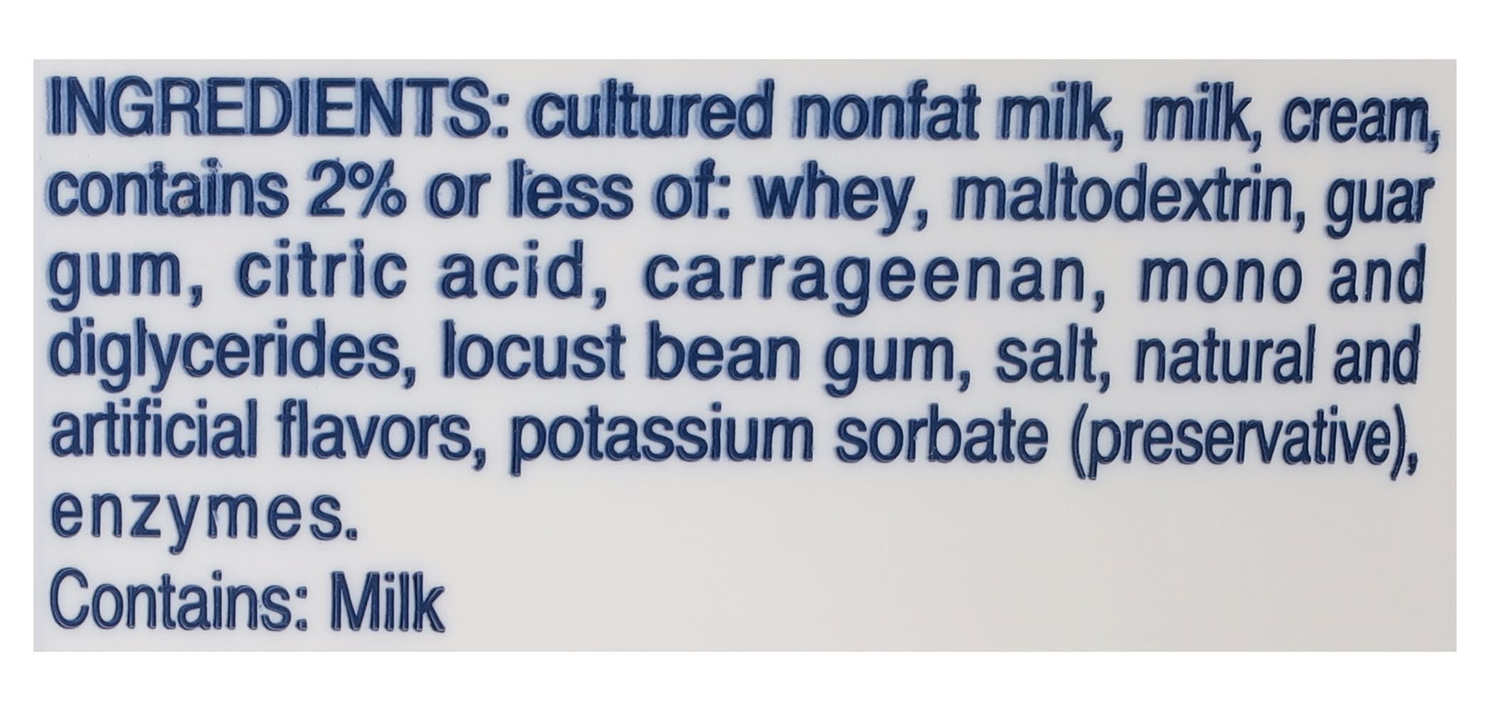 Ingredients: Cultured Nonfat Milk, Milk, Cream, Contains 2% or Less of: Whey, Maltodextrin, Guar Gum, Citric Acid, Carrageenan, Mono and Diglycerides, Locust Bean Gum, Salt, Natural and Artificial Flavors, Potassium Sorbate (Preservative), Enzymes Contains: Milk